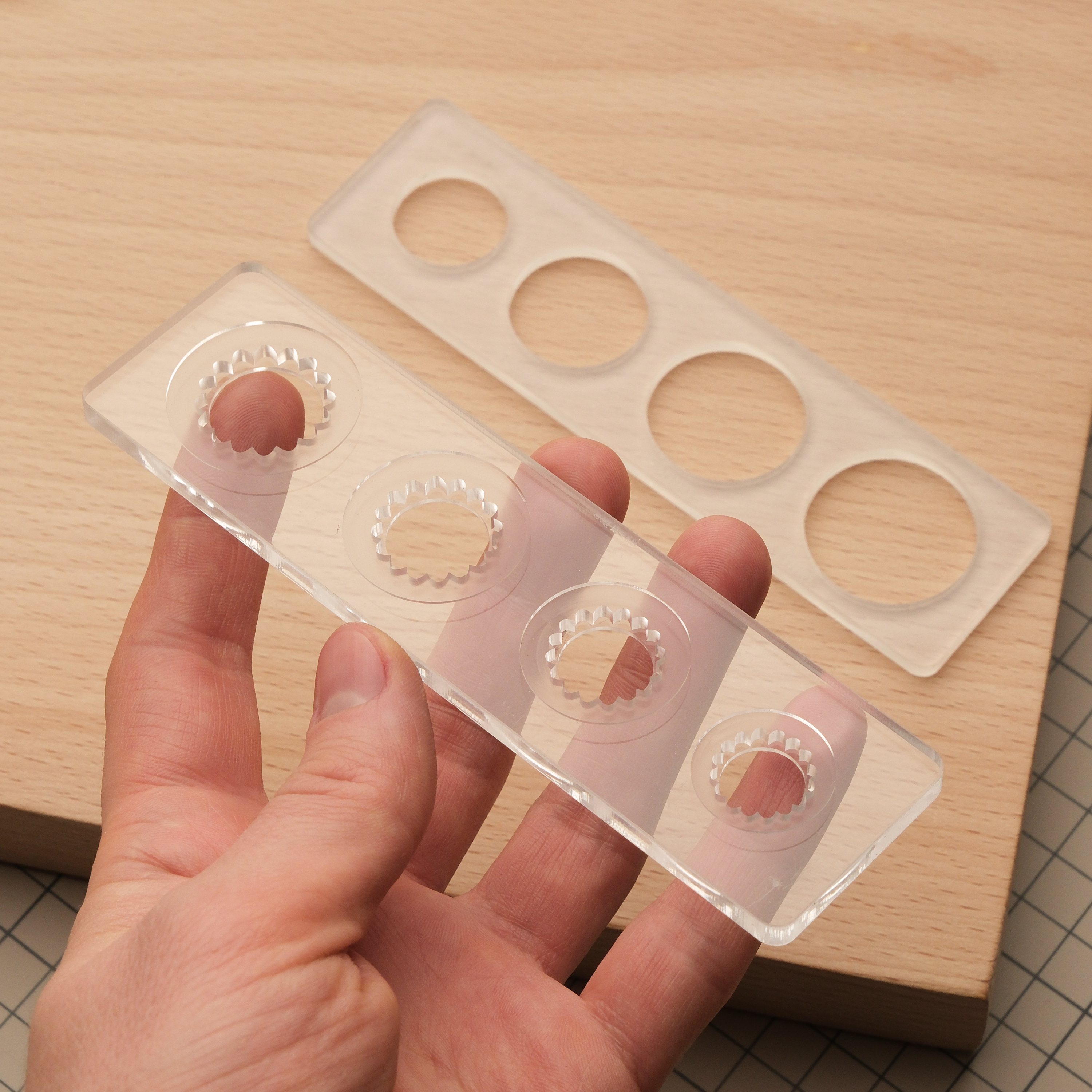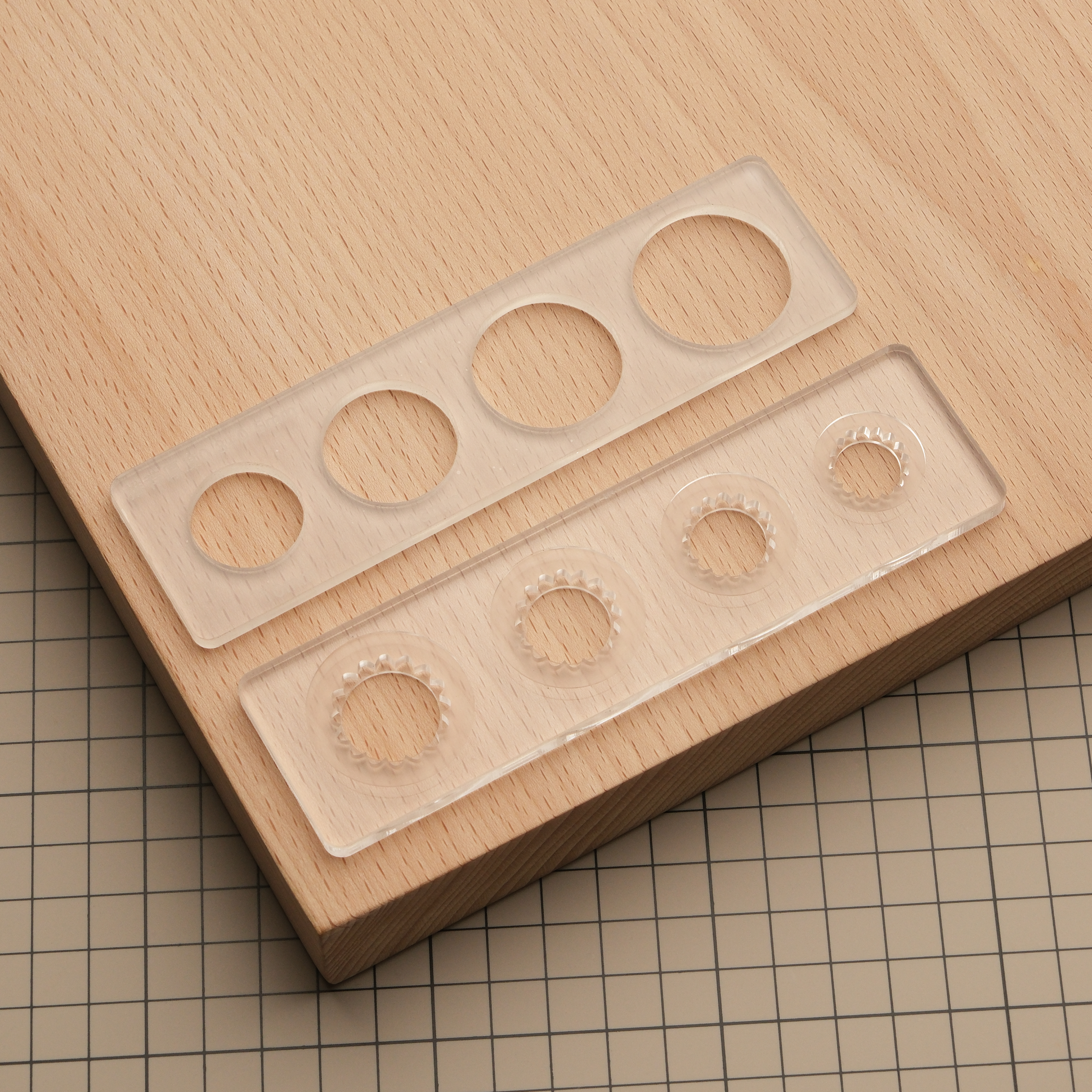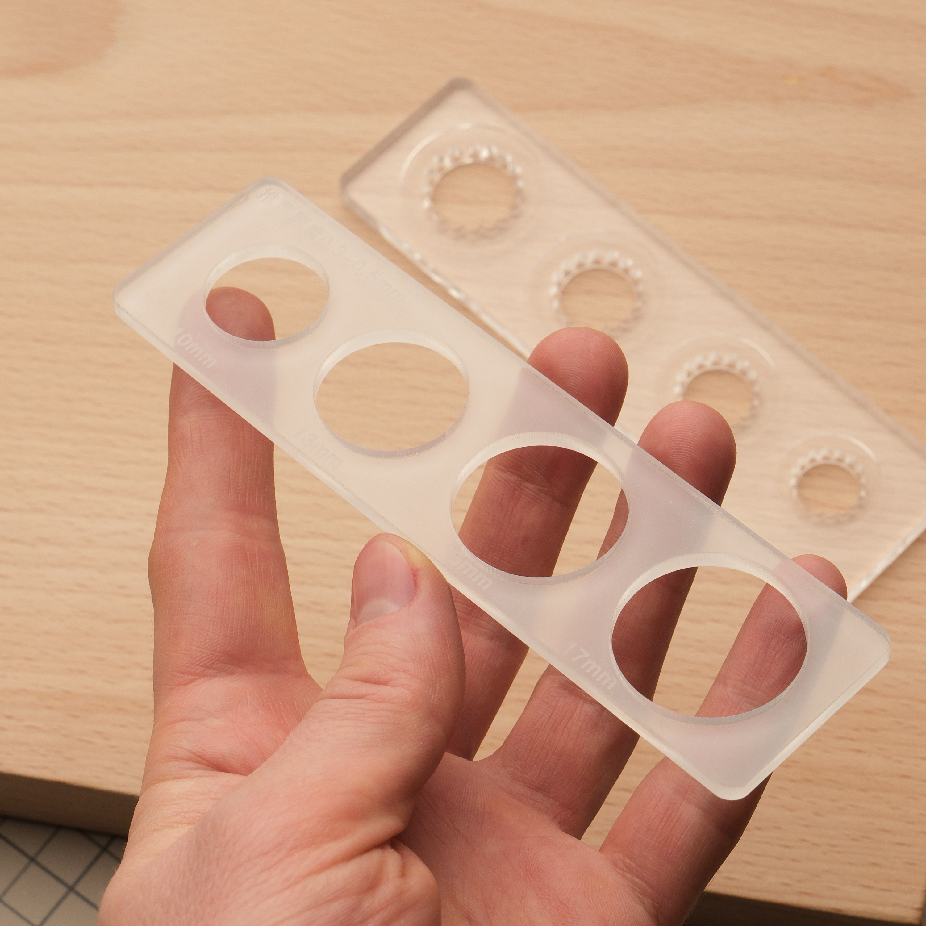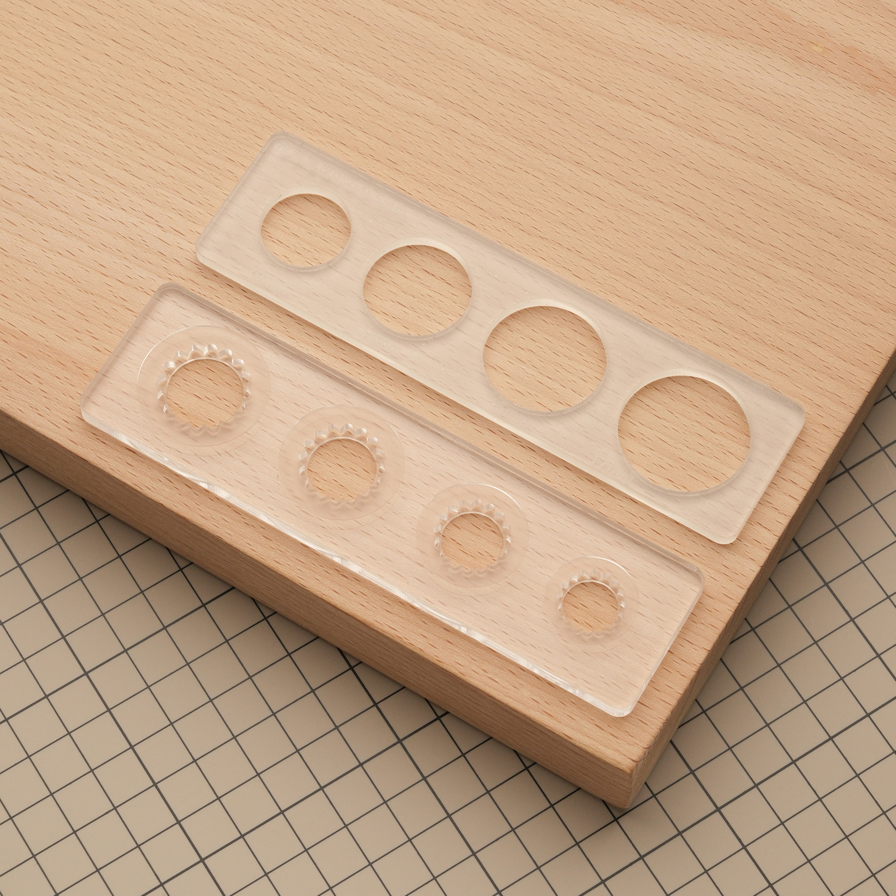 Акриловый шаблон для перетяжки кнопок тонкой кожей. Колодка подходит для кнопок самого разного диаметра. Рекомендованная толщина кожи для перетяжки - от 0,3 до 0,5 мм. В комплекте 2 детали - одна для вырезания куска кожи нужного диаметра, другая - для размещения и обтяжки кнопки.