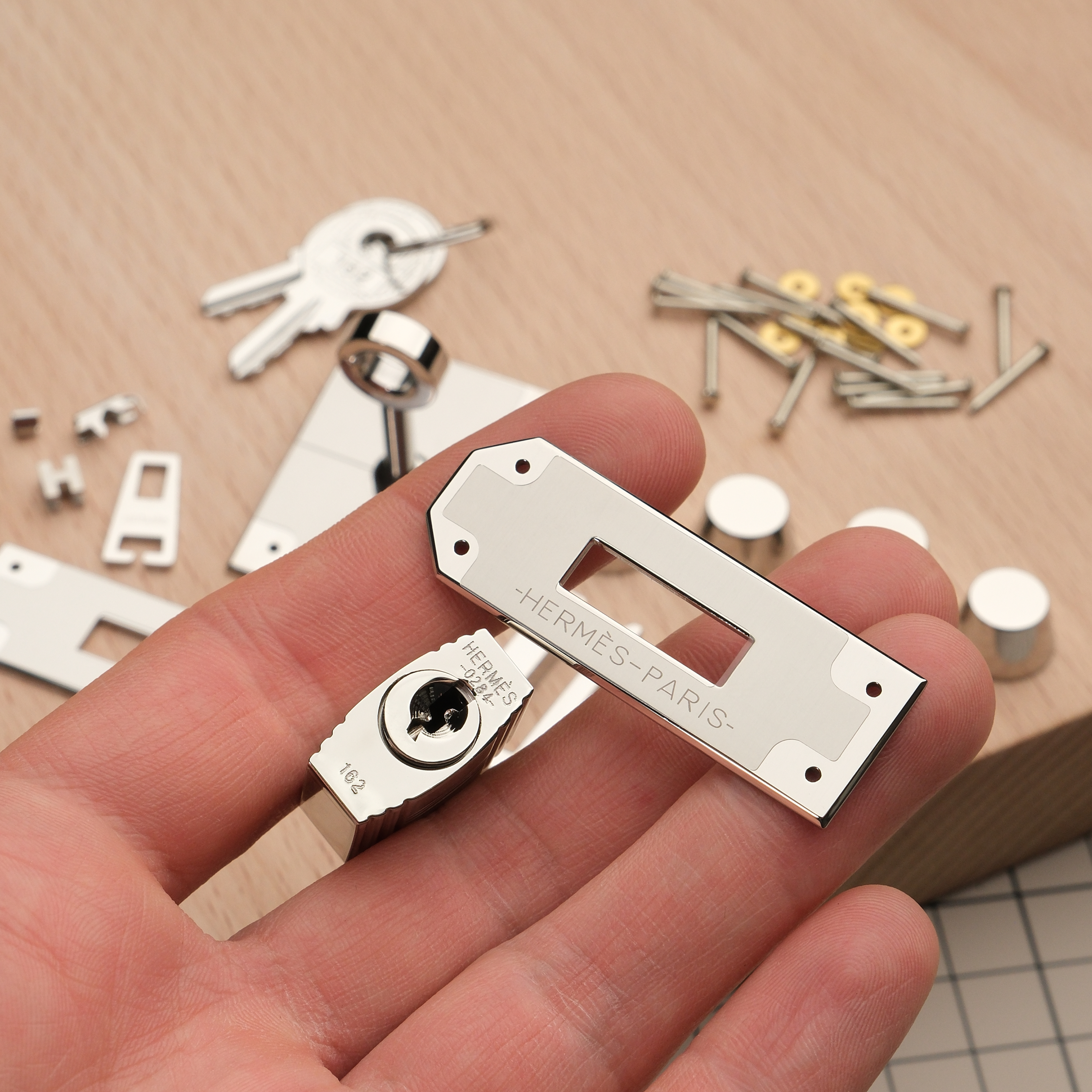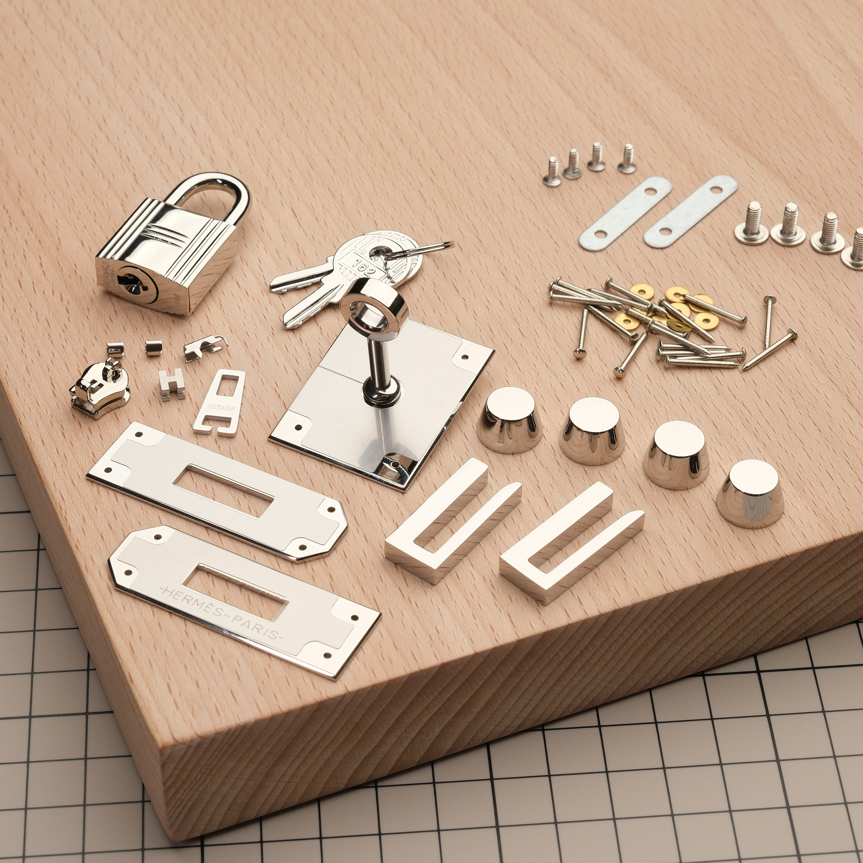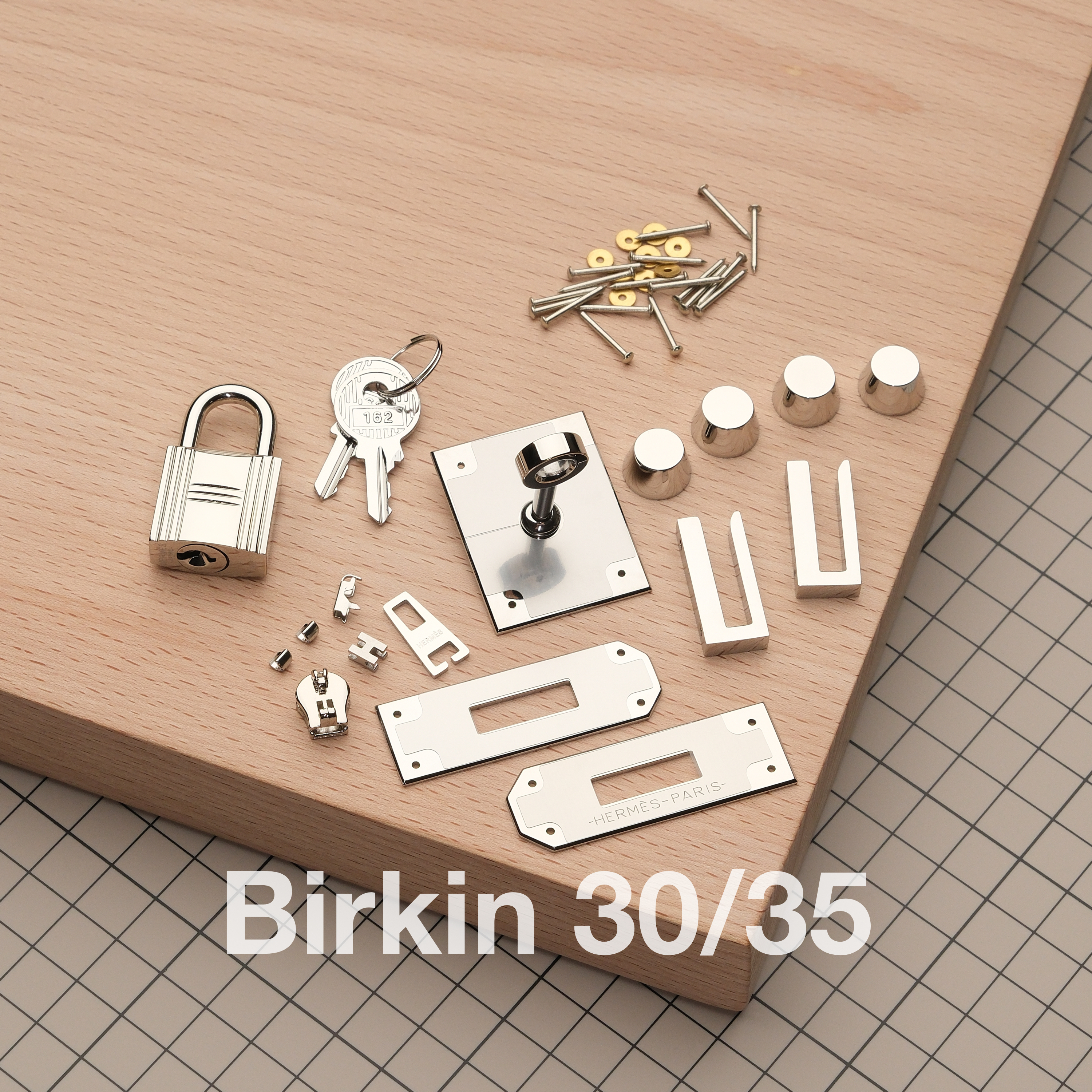 Набор фурнитуры высокого качества для изготовления сумки Birkin 30/35 на гвоздиках. Материал: полированная нержавеющая сталь. Логотипы бренда присутствуют на одной из пряжек, на замке, а также на пуллере. Замок идет в комплекте. Не забывайте использовать фиксатор резьбы при установке деталей на резьбе =)