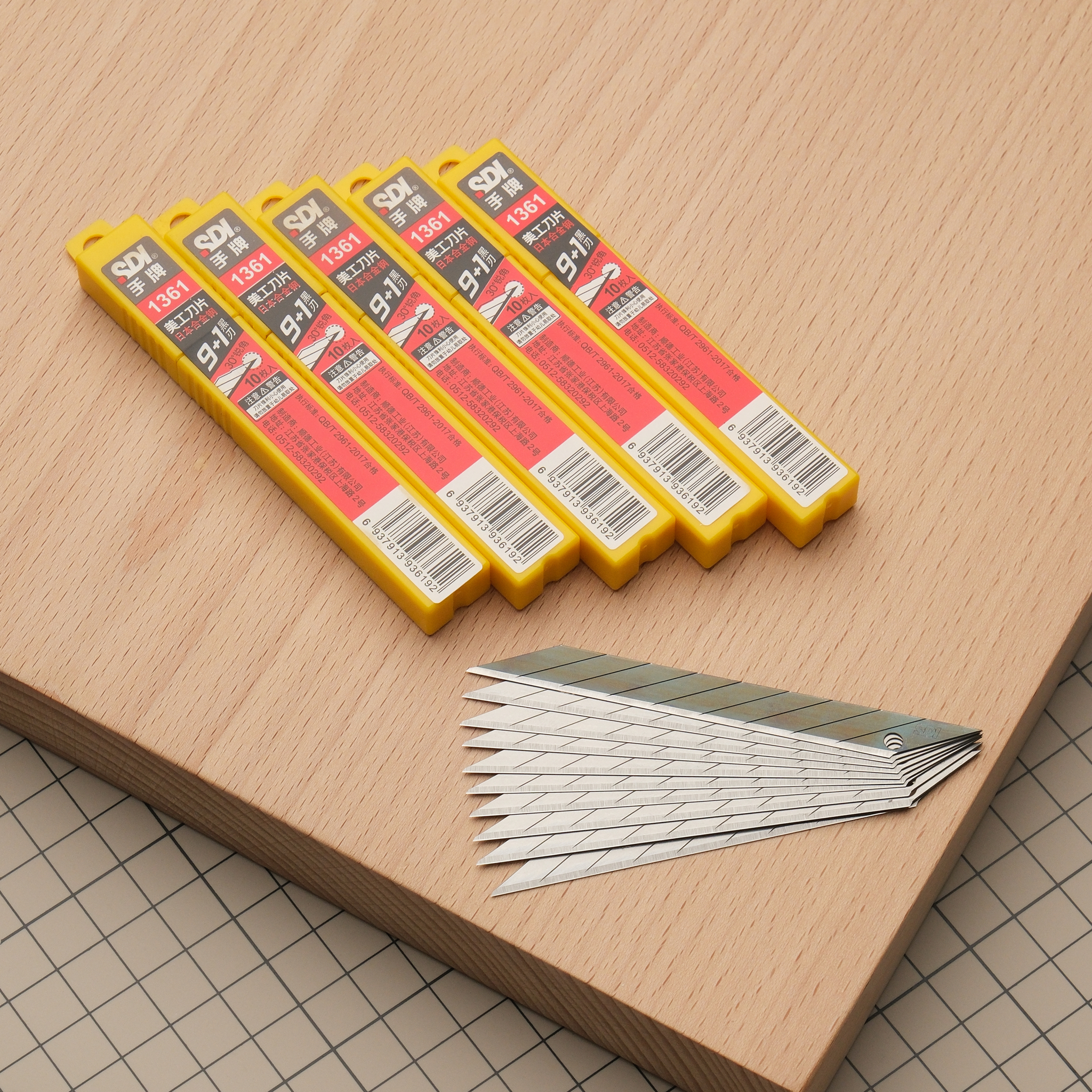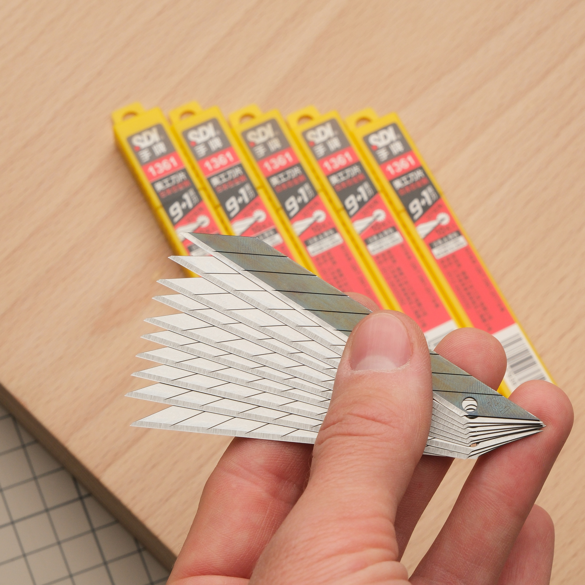 Упаковка из десяти 30-градусных лезвий для раскроечного ножа SDI: одного каленого и девяти стандартных. Лезвия совместимы со многими другими ножами вроде OLFA, TAJIMA и др.