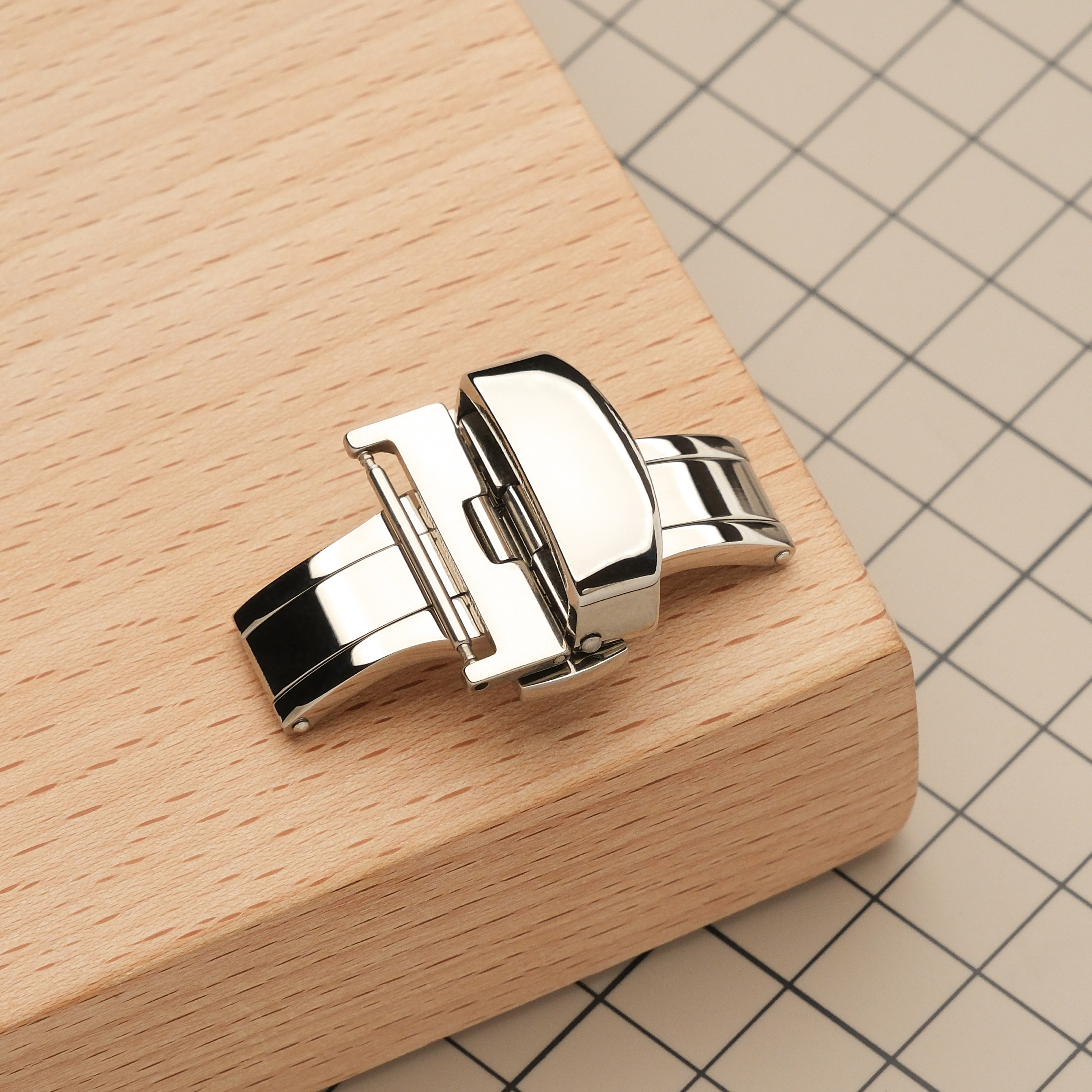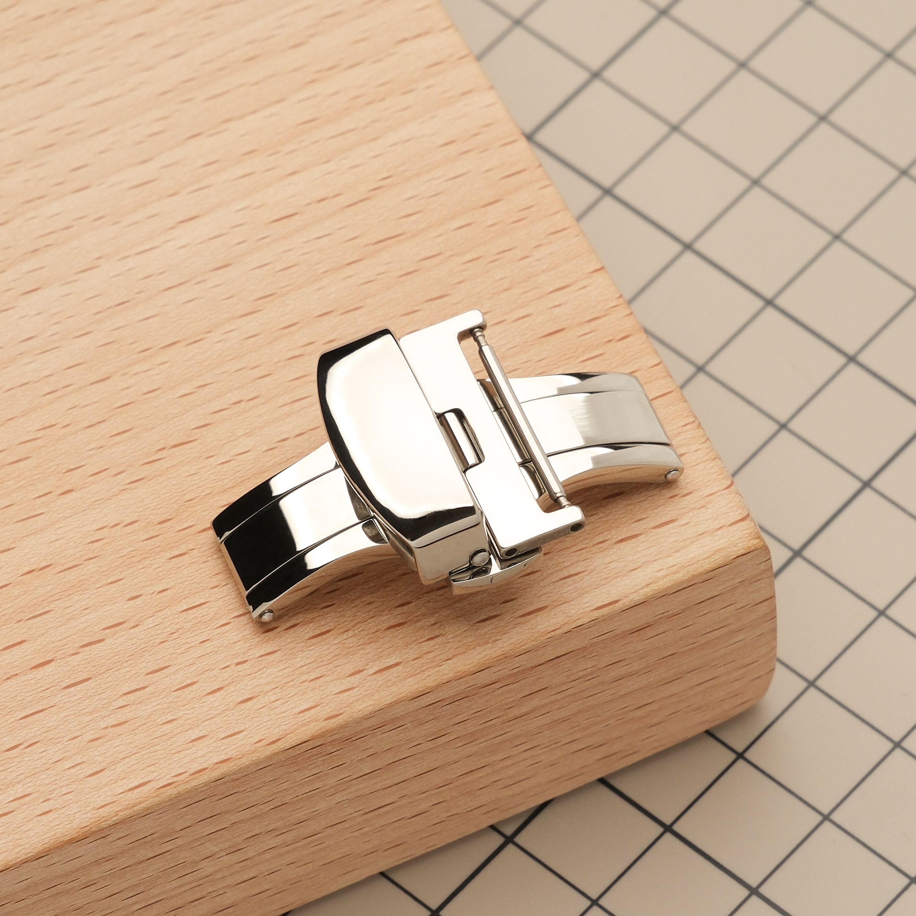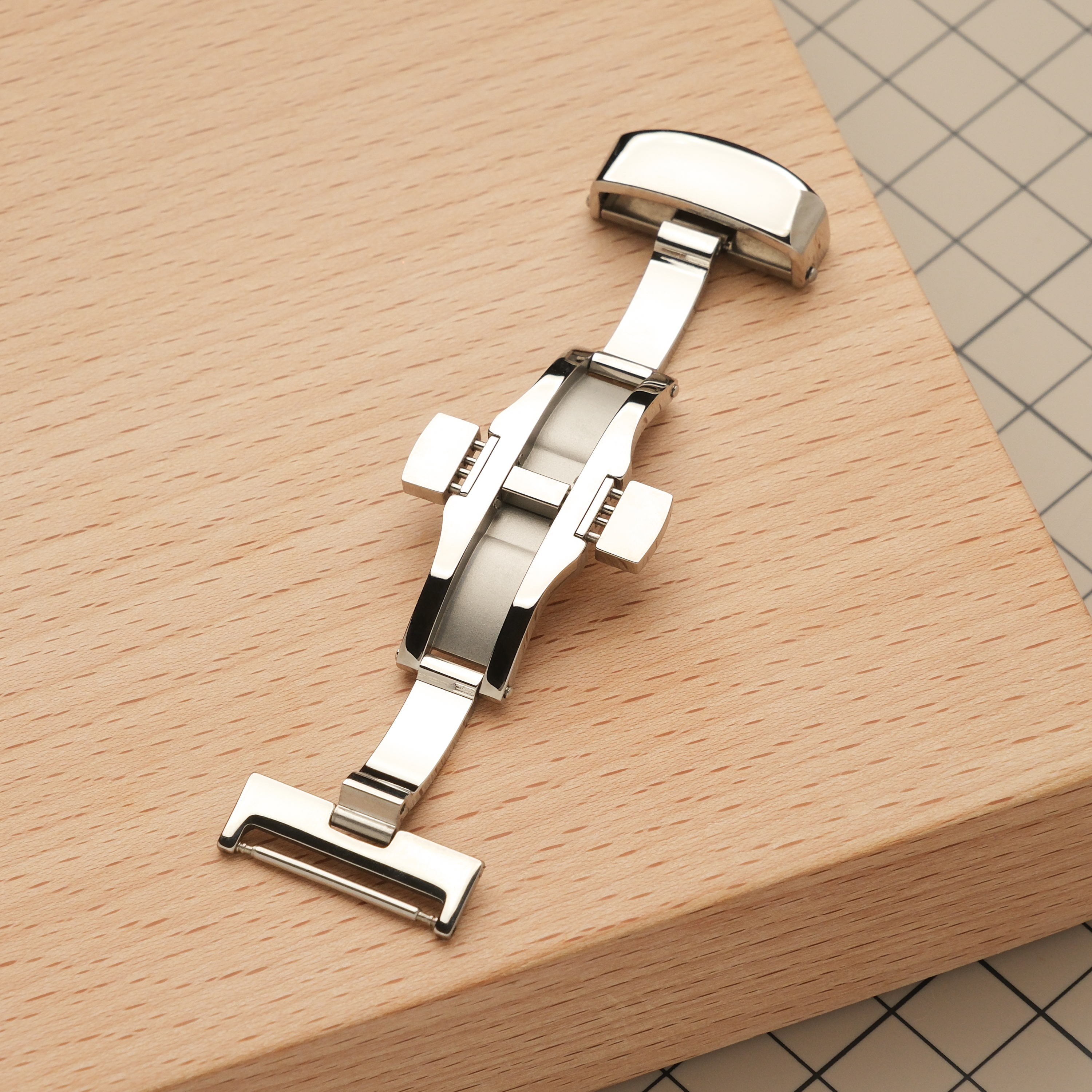 Эта автоматическая застежка-бабочка используется вместо обычной бакли на часовых ремешках высокого класса. Использование такой застежки продлевает жизнь ремешку, так как ежедневно не происходит перегибов его длинной части, а торцы ремешка не трутся об металл. Кроме этого, снимать и надевать часы с ней значительно удобнее и быстрее, а боковые кнопки на застежке не дают ей свободно раскрываться. Застежка изготовлена из нержавеющей стали. Штифт для короткой части ремешка идет в комплекте. Для длинной части ремешка потребуются круглые отверстия диаметром 2 мм.