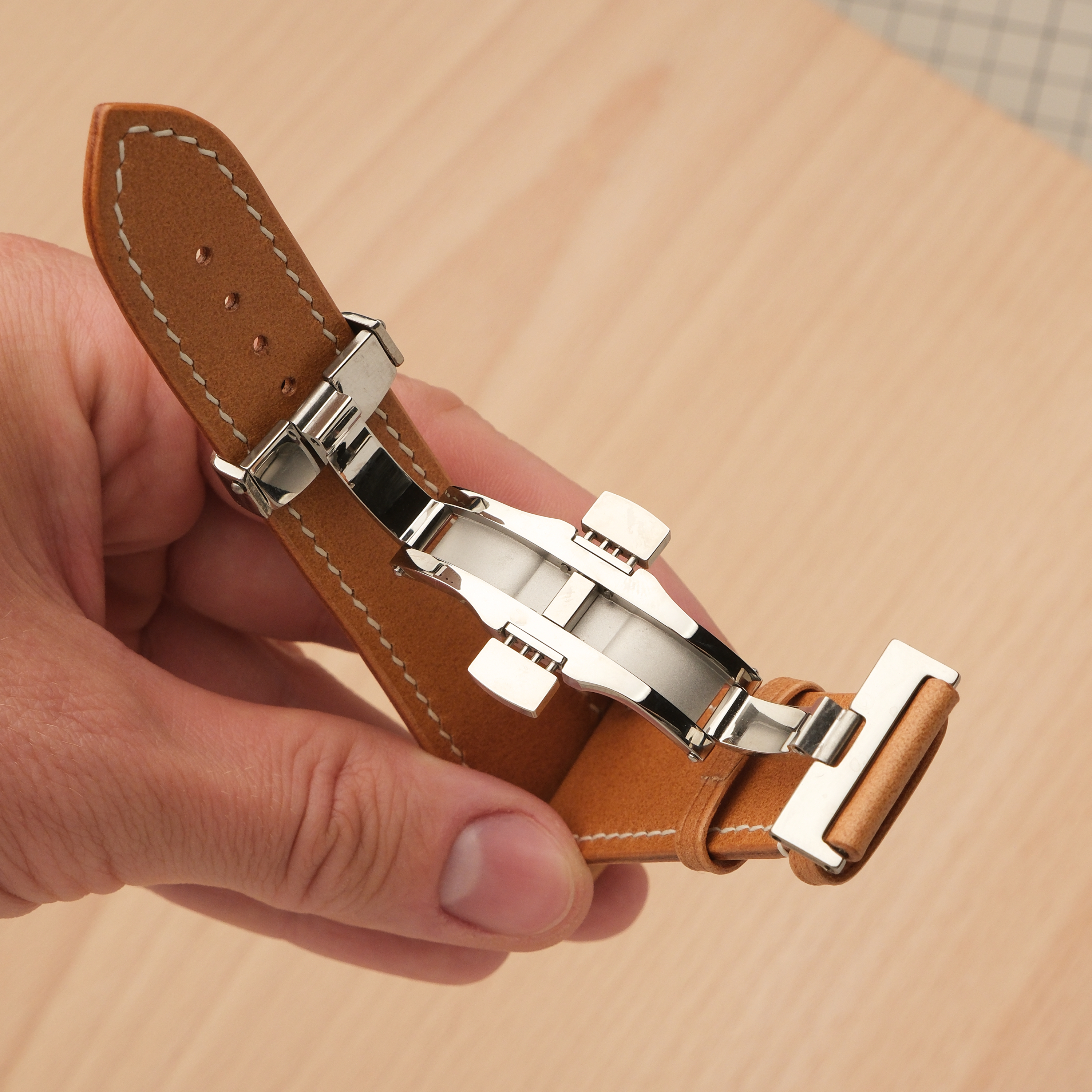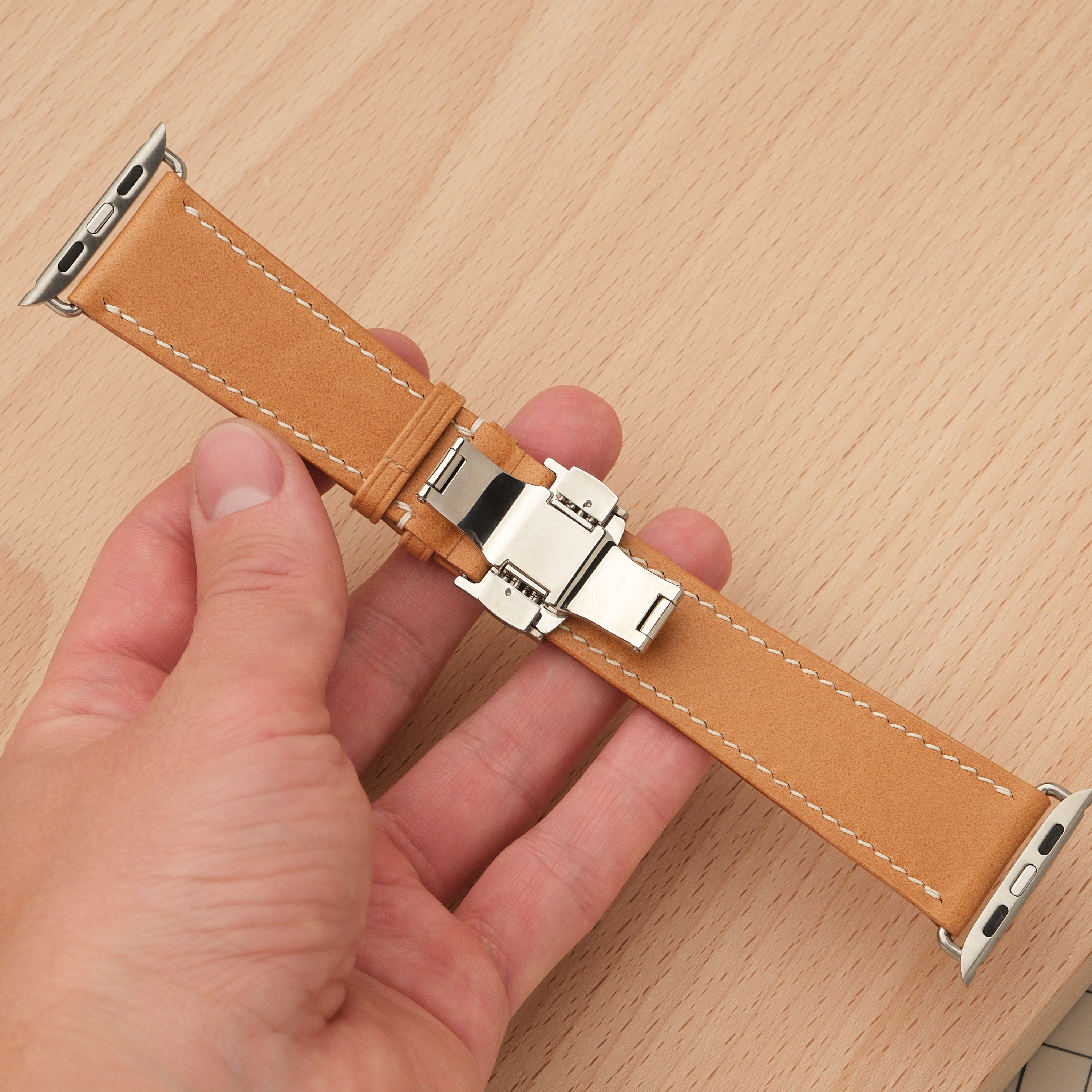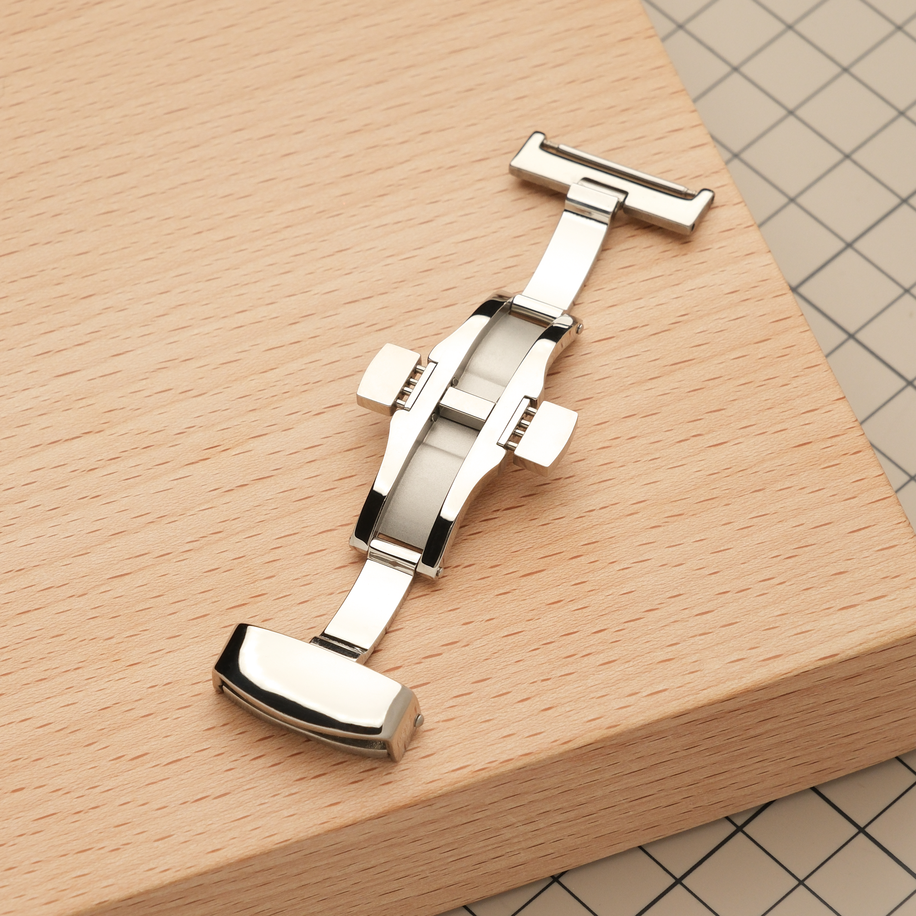 Эта автоматическая застежка-бабочка используется вместо обычной бакли на часовых ремешках высокого класса. Использование такой застежки продлевает жизнь ремешку, так как ежедневно не происходит перегибов его длинной части, а торцы ремешка не трутся об металл. Кроме этого, снимать и надевать часы с ней значительно удобнее и быстрее, а боковые кнопки на застежке не дают ей свободно раскрываться. Застежка изготовлена из нержавеющей стали. Штифт для короткой части ремешка идет в комплекте. Для длинной части ремешка потребуются круглые отверстия диаметром 2 мм.
