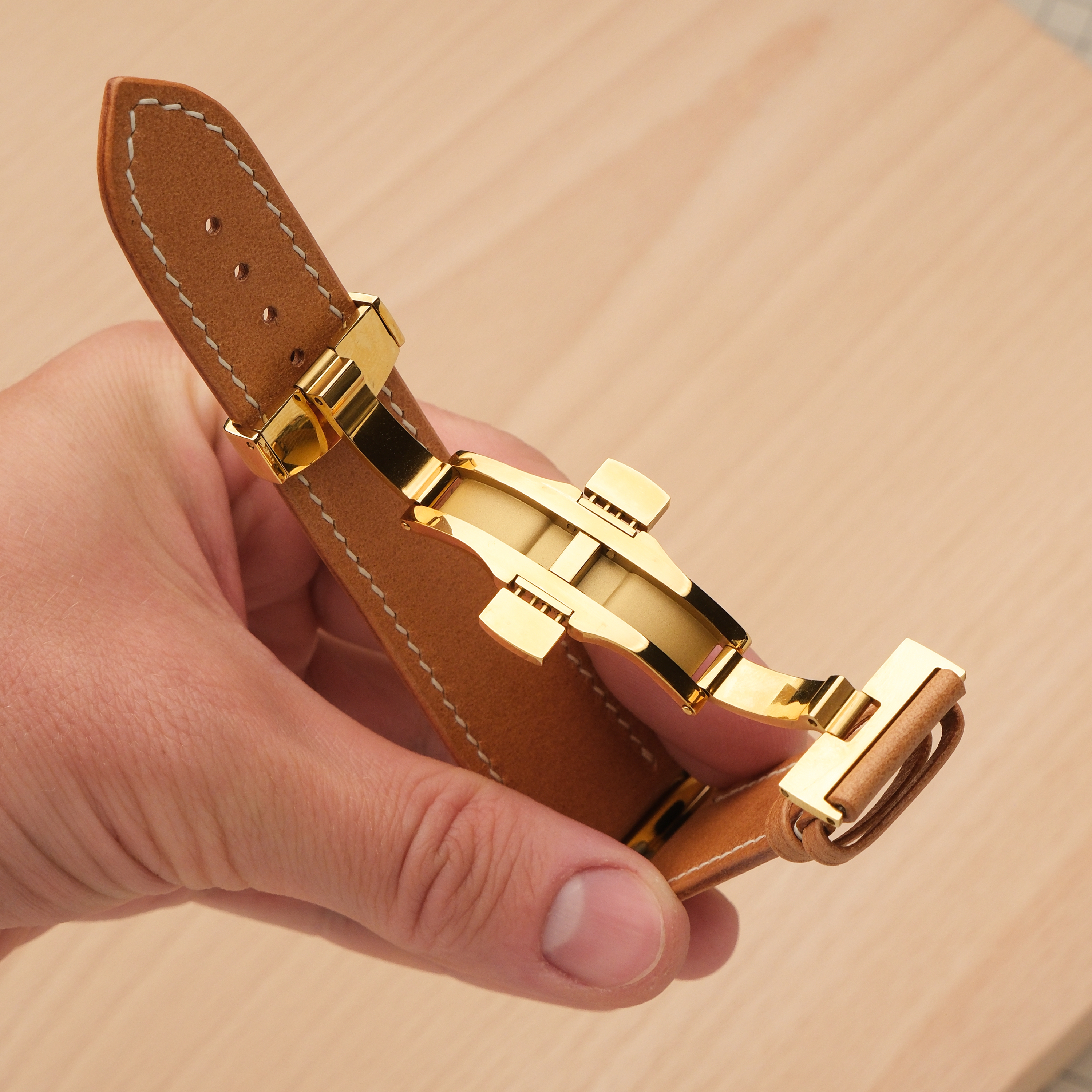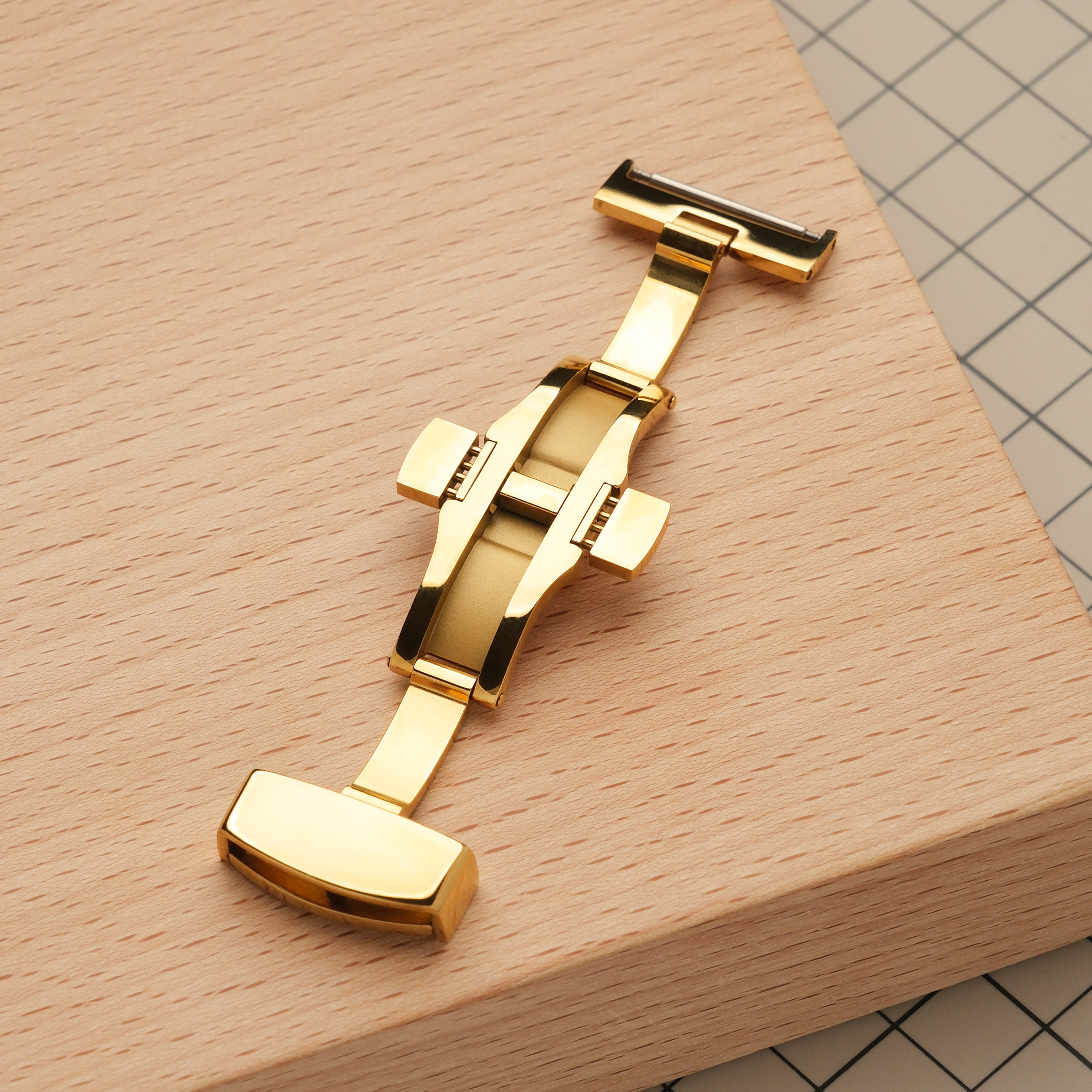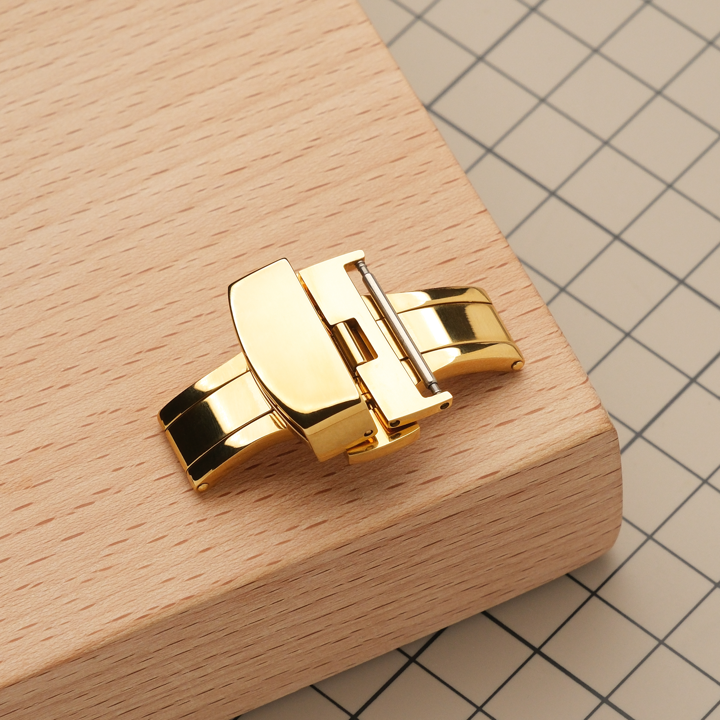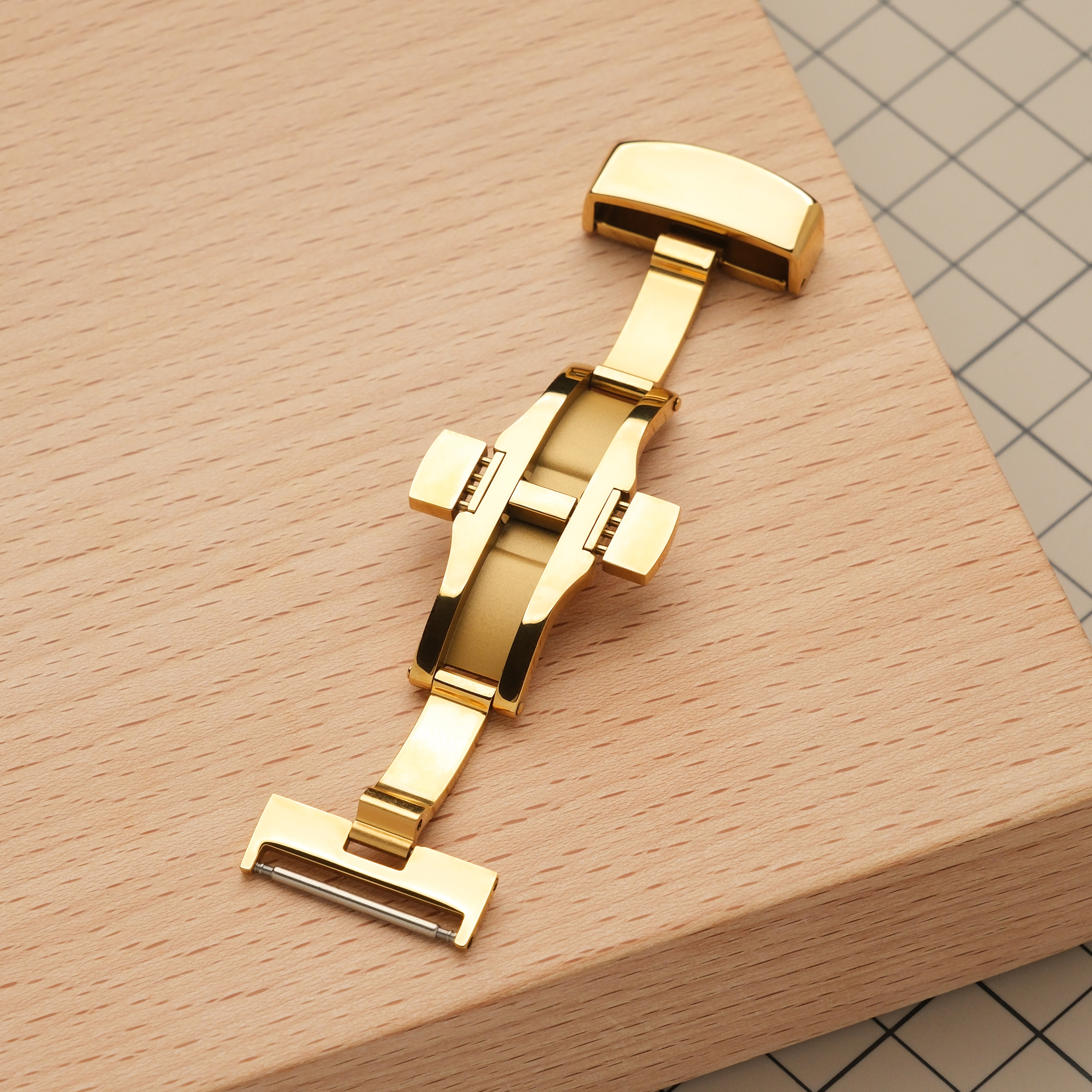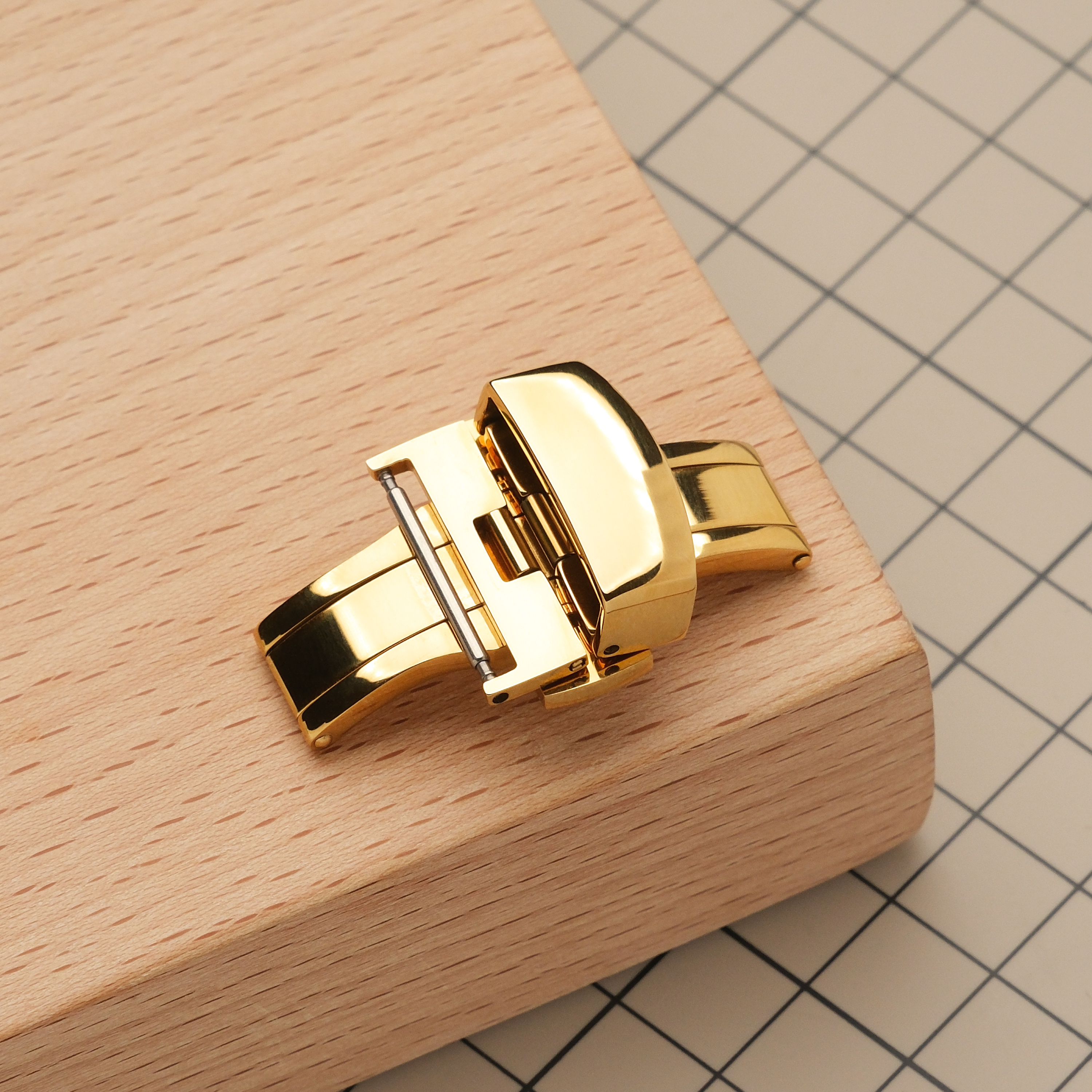 Эта автоматическая застежка-бабочка используется вместо обычной бакли на часовых ремешках высокого класса. Использование такой застежки продлевает жизнь ремешку, так как ежедневно не происходит перегибов его длинной части, а торцы ремешка не трутся об металл. Кроме этого, снимать и надевать часы с ней значительно удобнее и быстрее, а боковые кнопки на застежке не дают ей свободно раскрываться. Застежка изготовлена из нержавеющей стали, краска нанесена гальваническим методом. Штифт для короткой части ремешка идет в комплекте. Для длинной части ремешка потребуются круглые отверстия диаметром 2 мм.