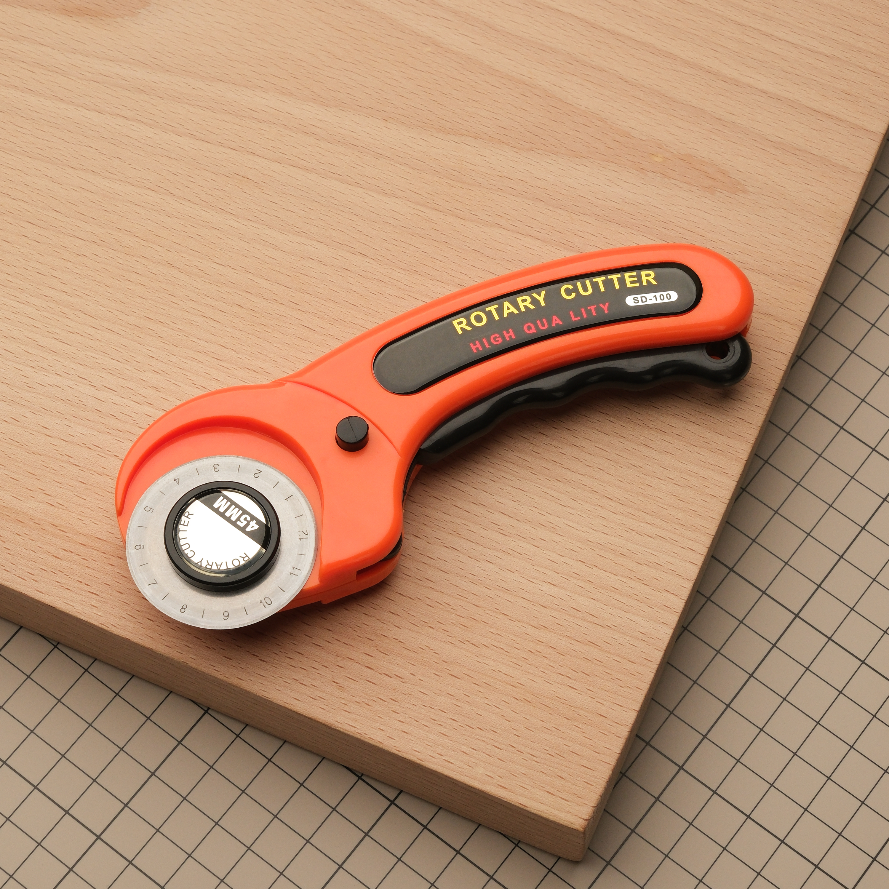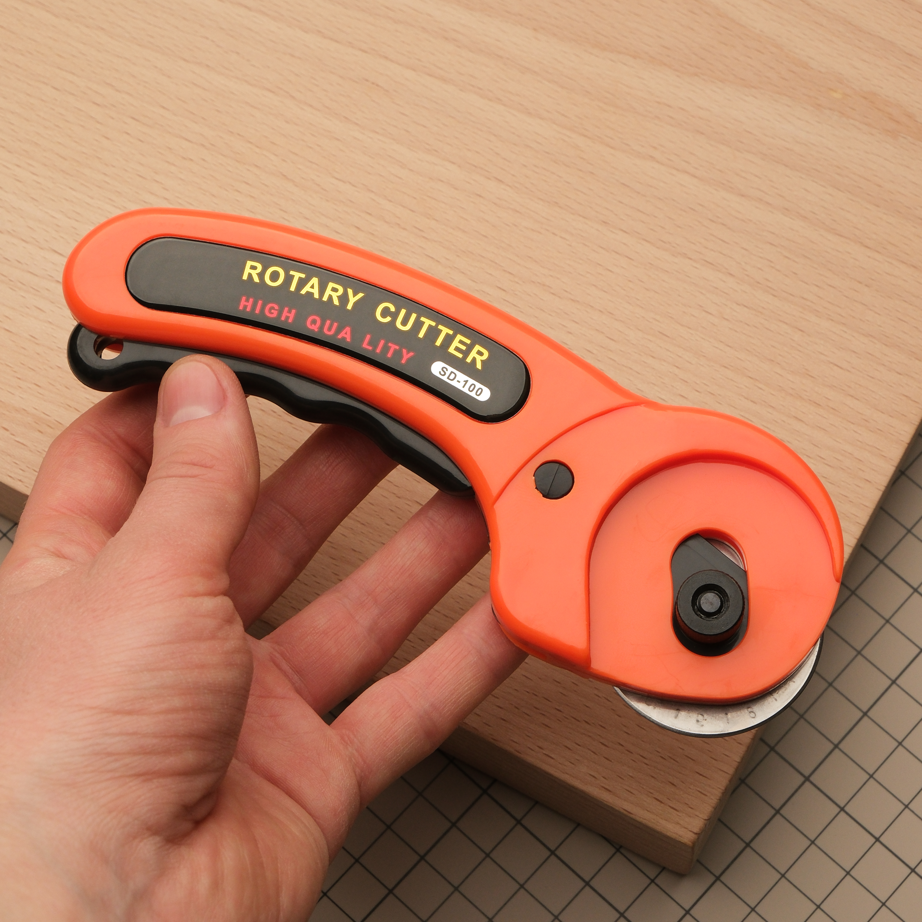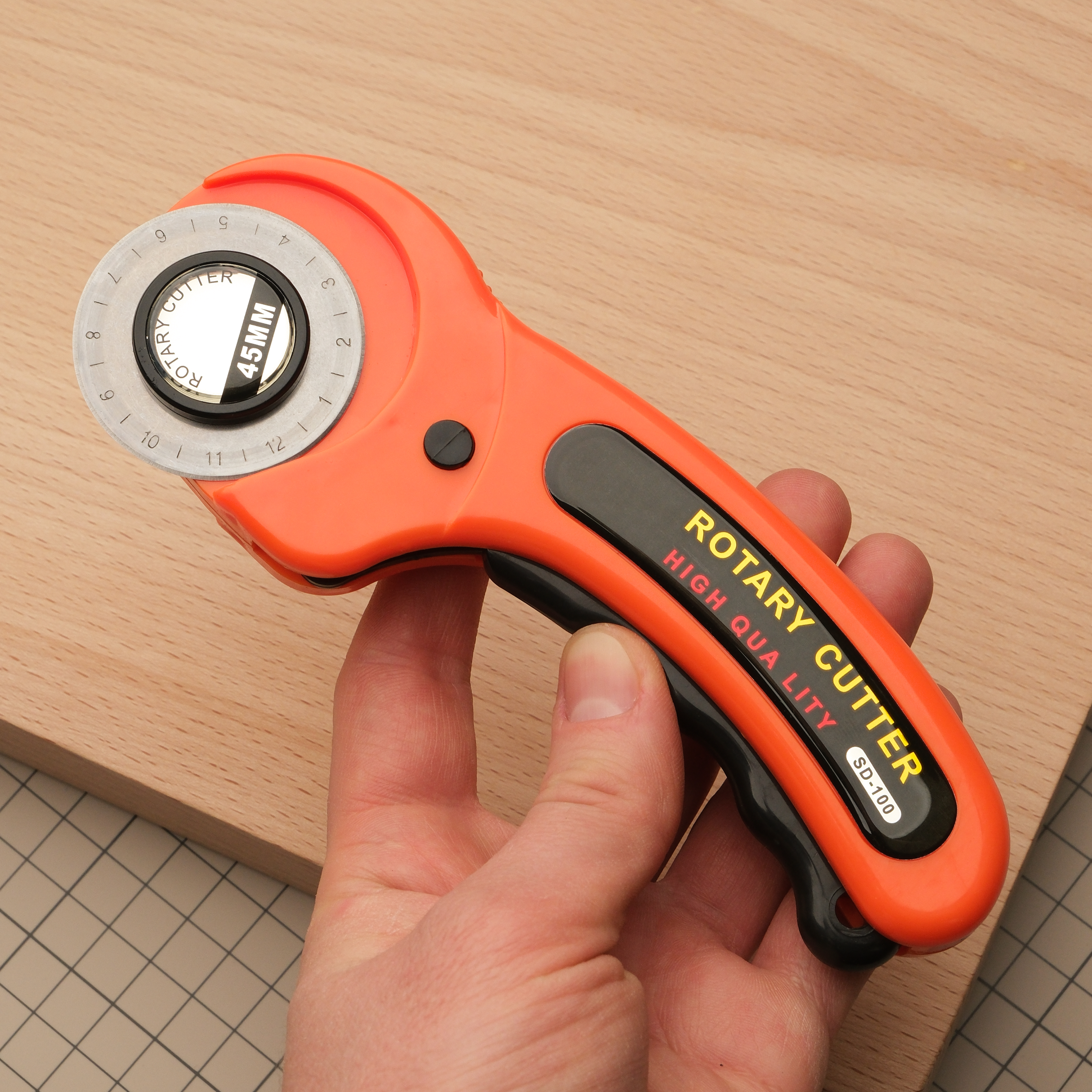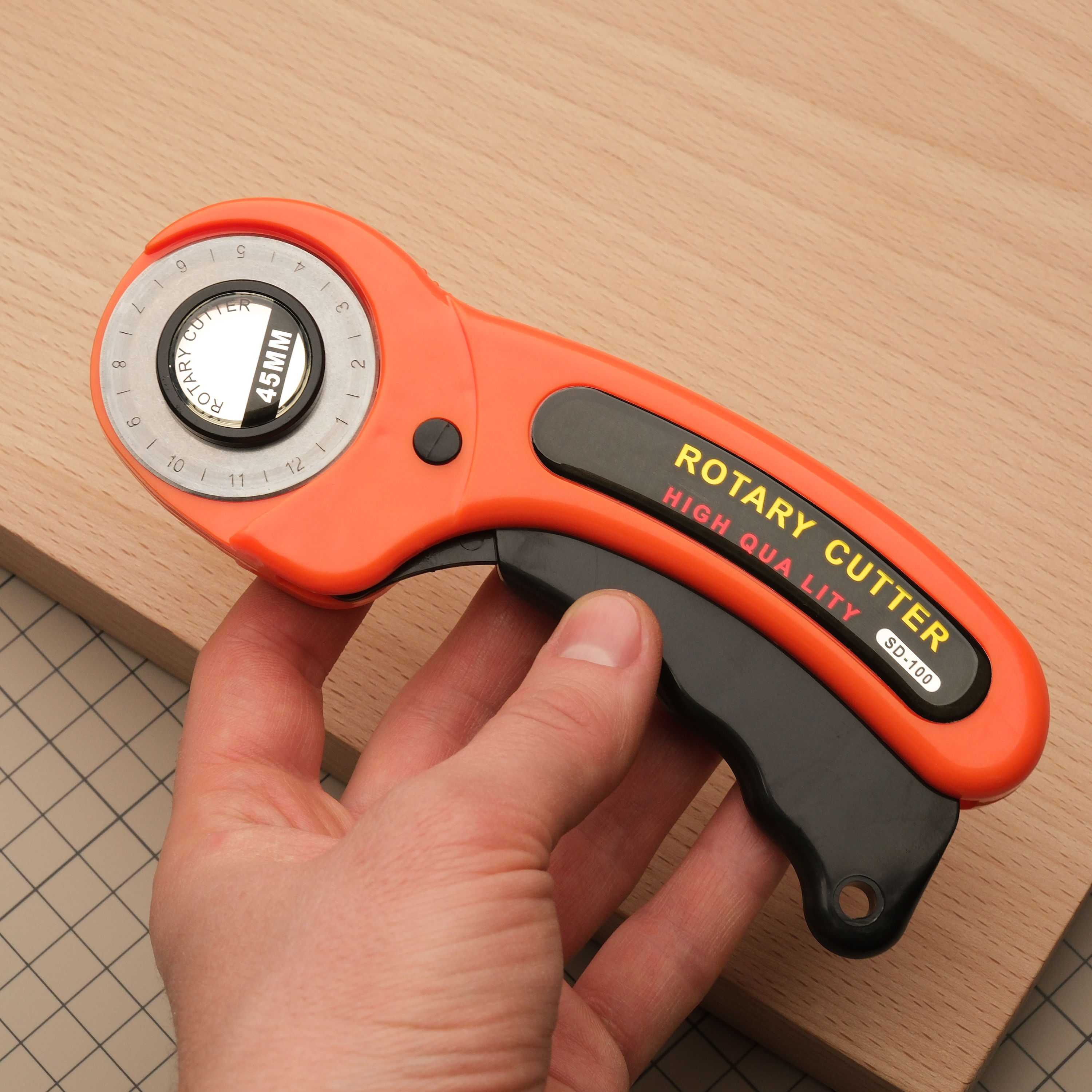 Классический круговой нож с лезвием диаметром 45 мм. Лезвие автоматически выдвигается и прячется при нажатии и опускании ручки. Также можно зафиксировать положение лезвия с помощью кнопки. Крайне полезный инструмент при раскрое материалов, не тащит материал по столу, позволяет комфортно работать с тканями и другими тонкими материалами. Лезвие легко и просто меняется при необходимости.