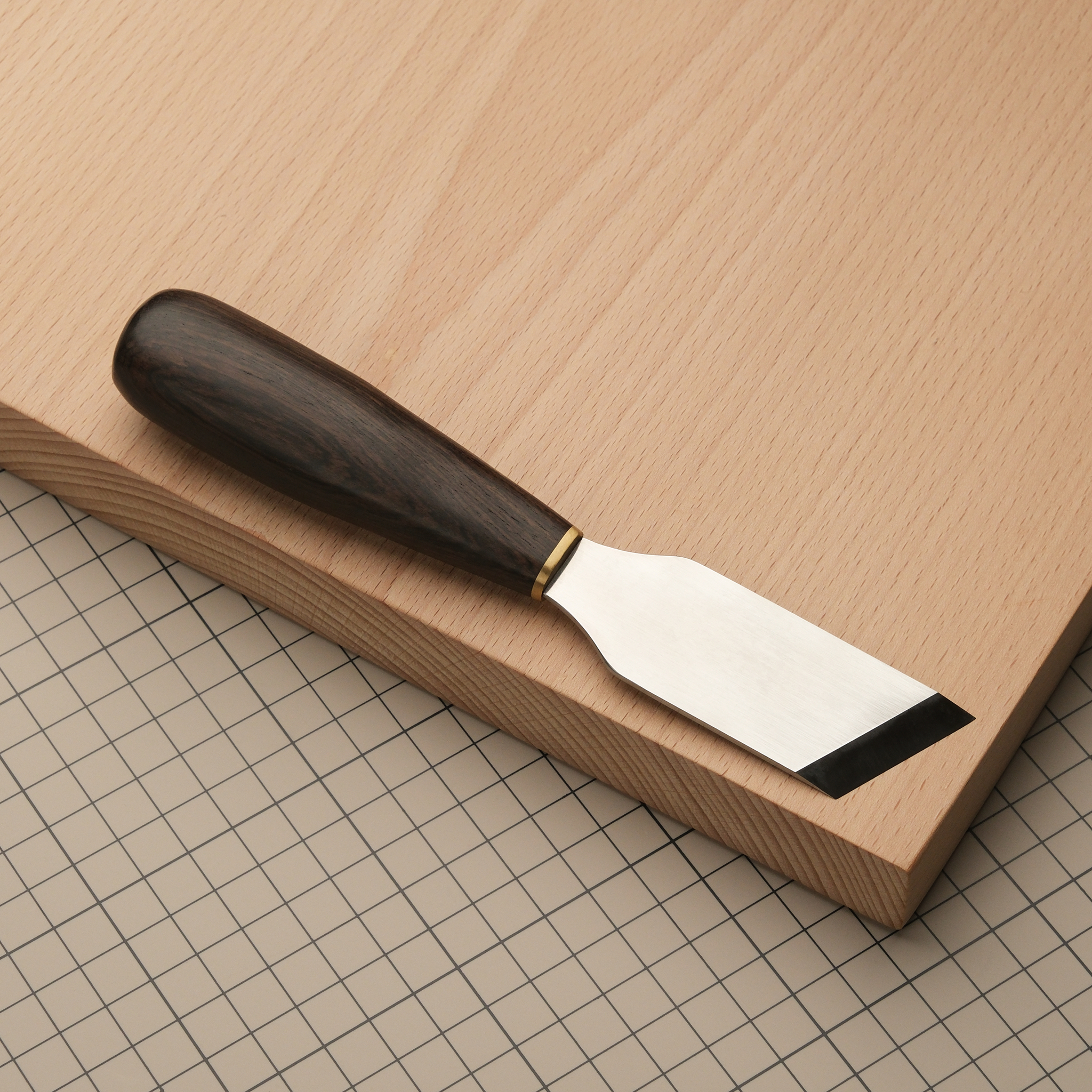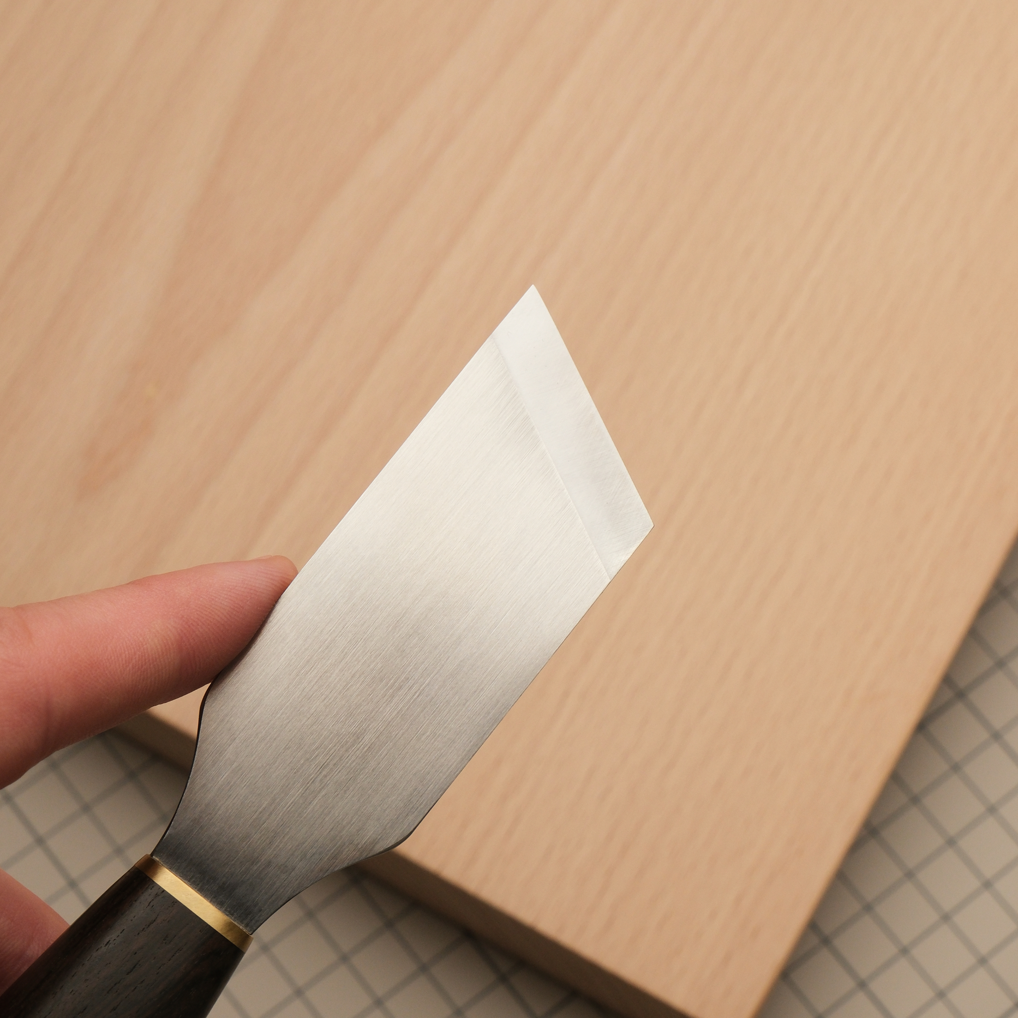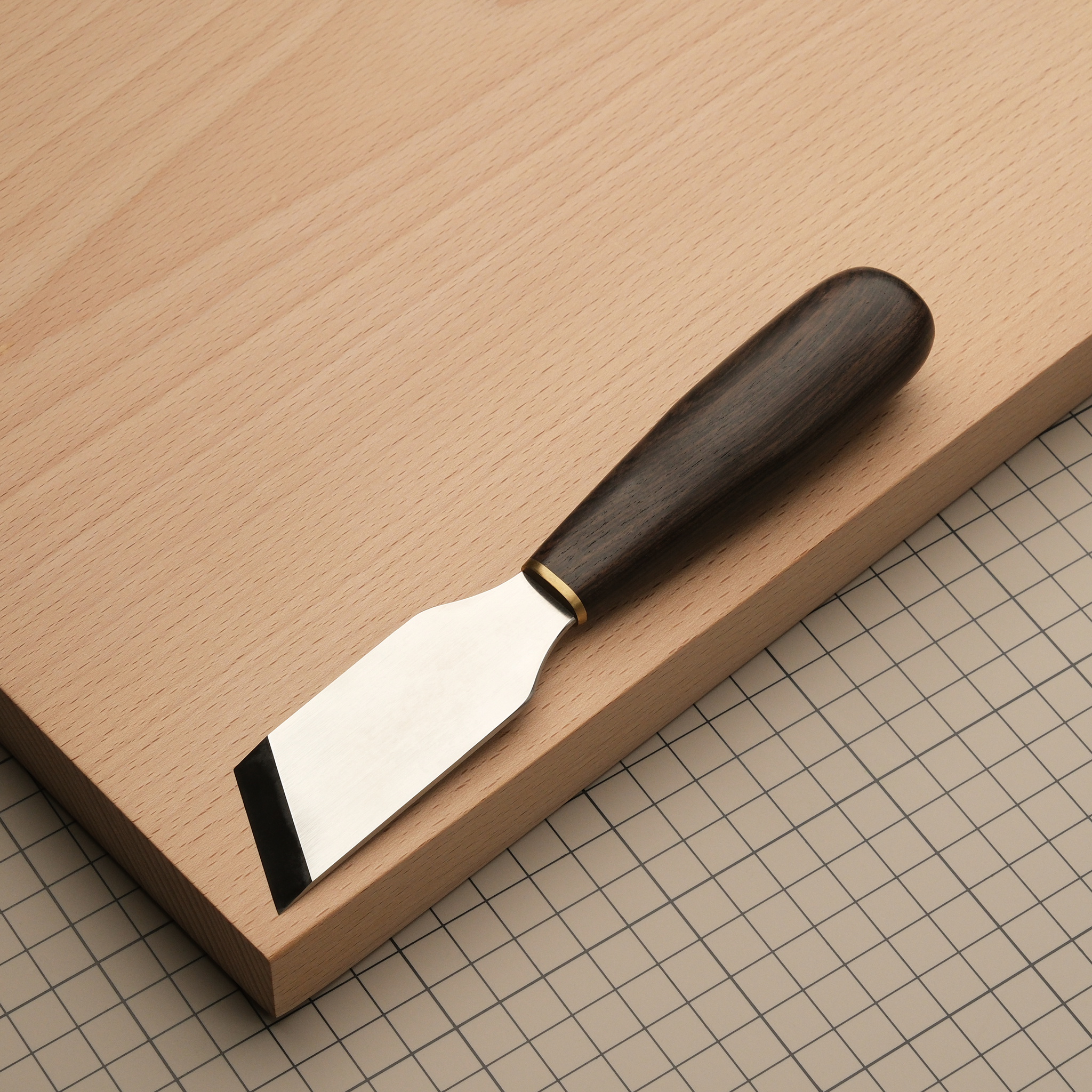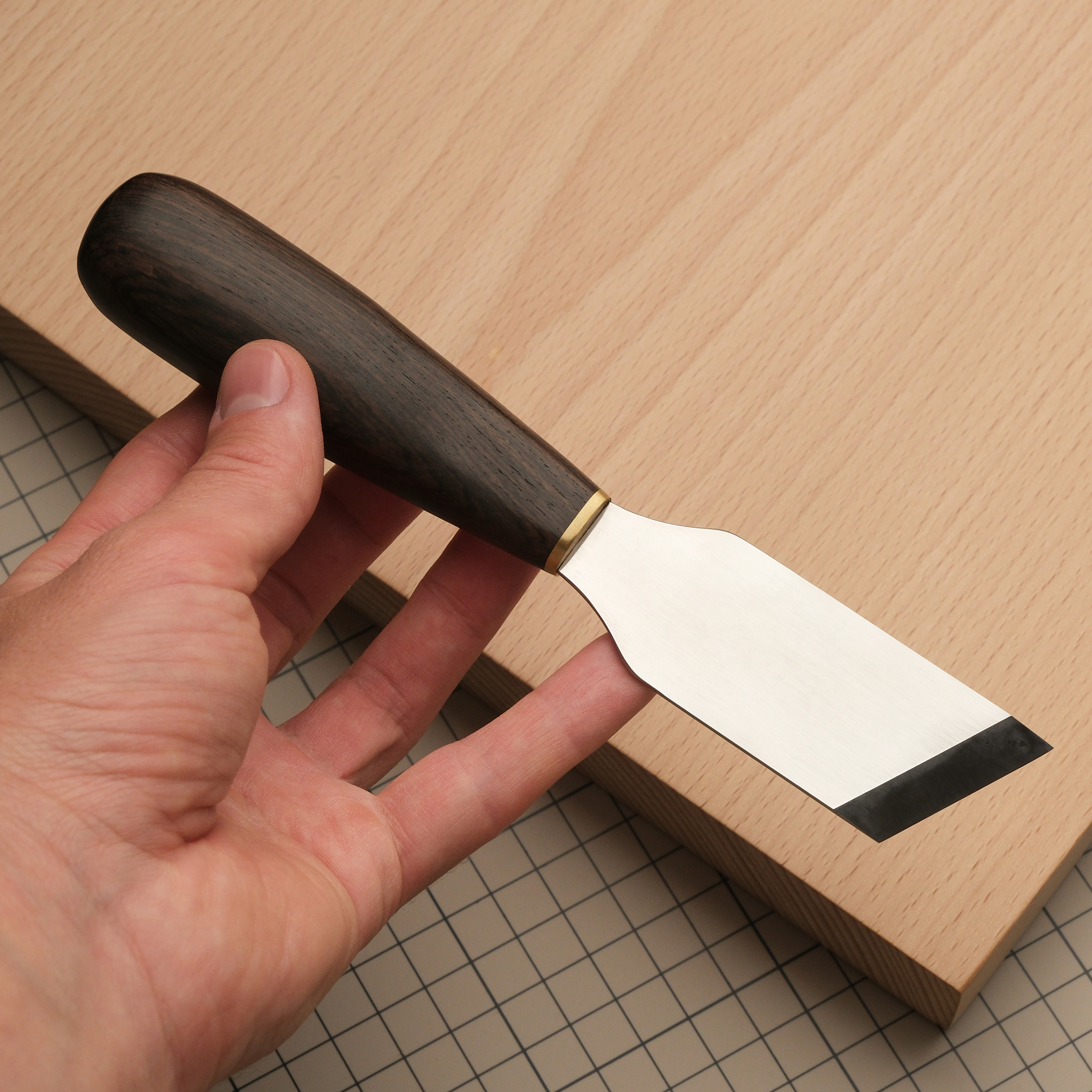 Отличный нож, за счет геометрии лезвия позволяющий выполнять шерфовку под очень небольшими углами. Хорошо подходит для раскроя кожи. 10-сантиметровая ручка из эбена с латунным больстером. Очень эргономичная, приятно лежит в руке. Лезвие: 80*30*2 мм, длина лезвия по диагонали – 34 мм. Угол заточки - 15 градусов.