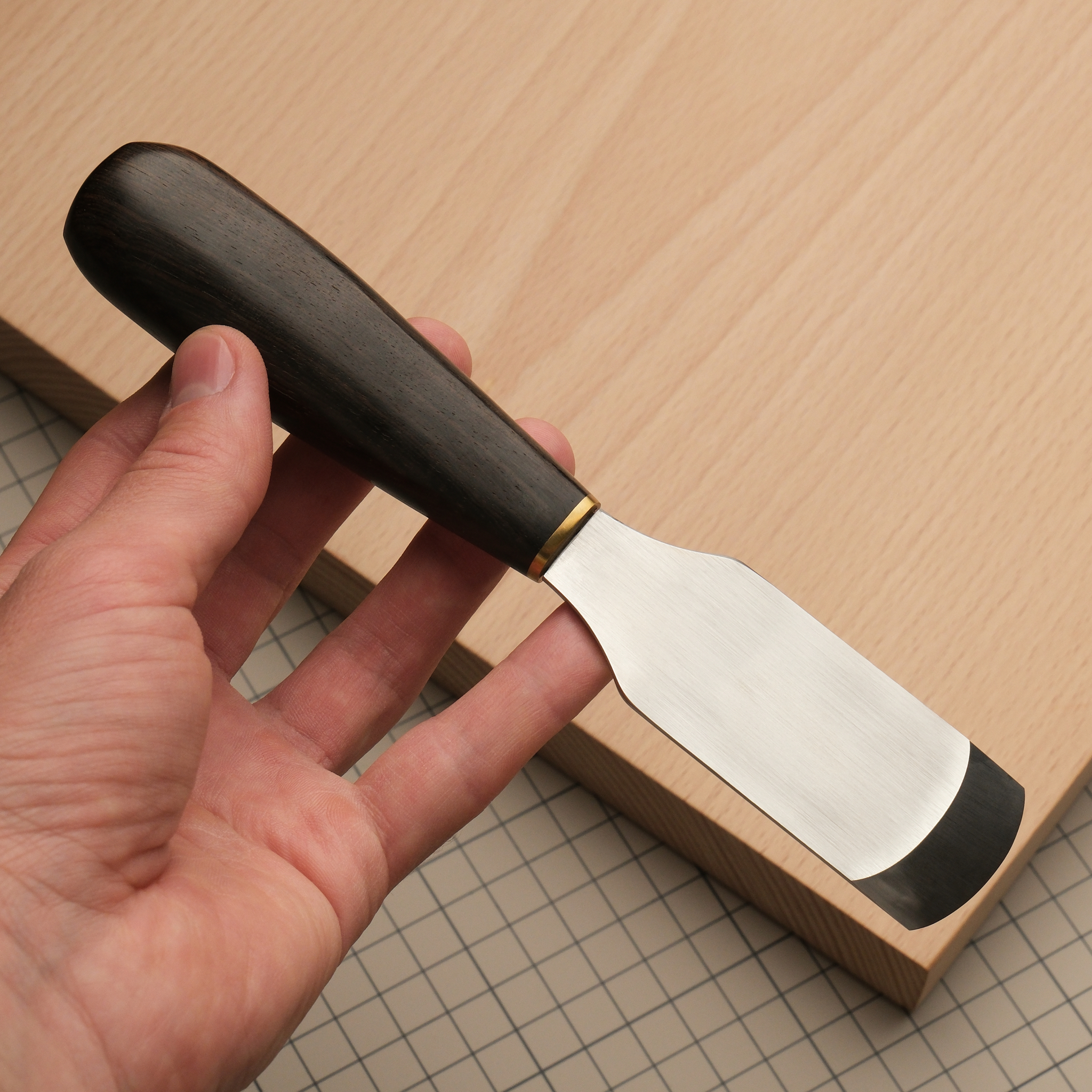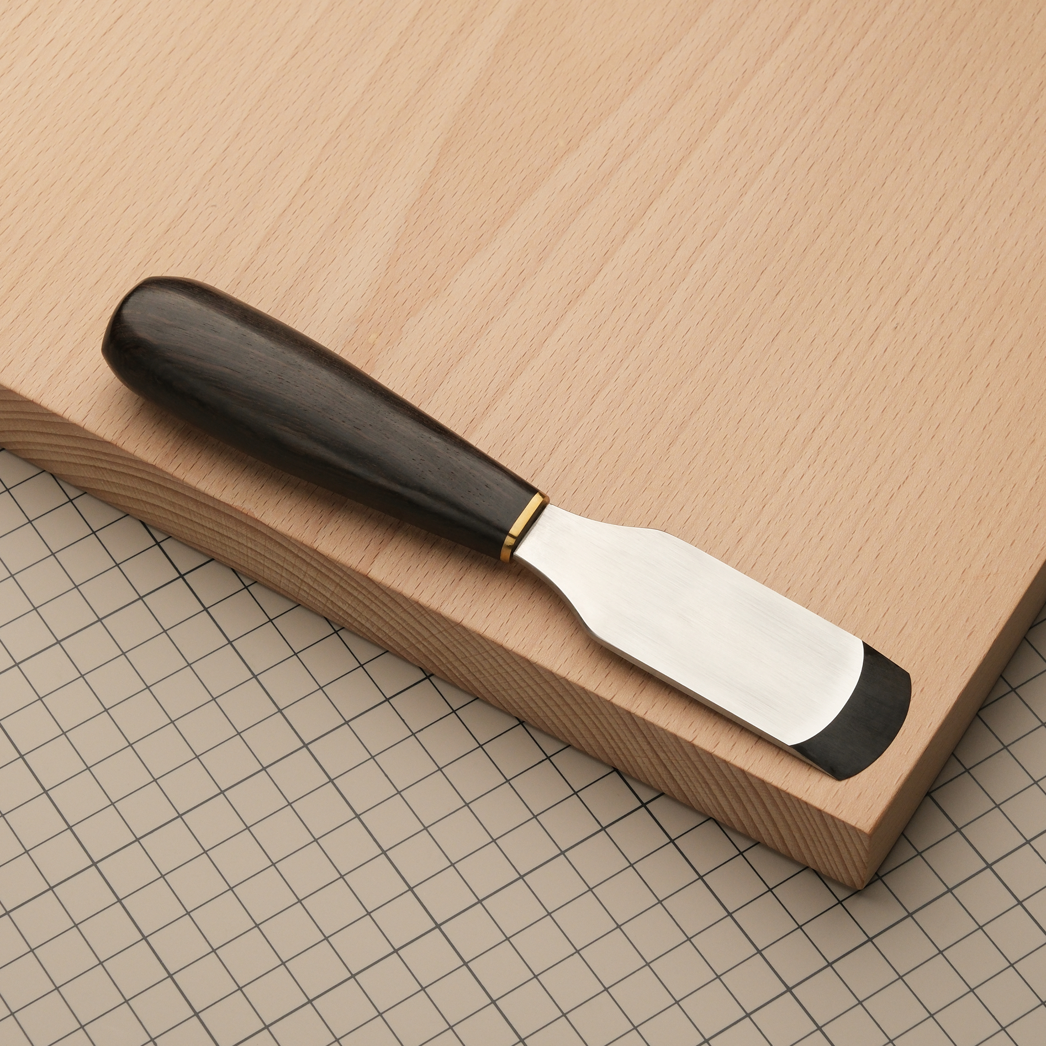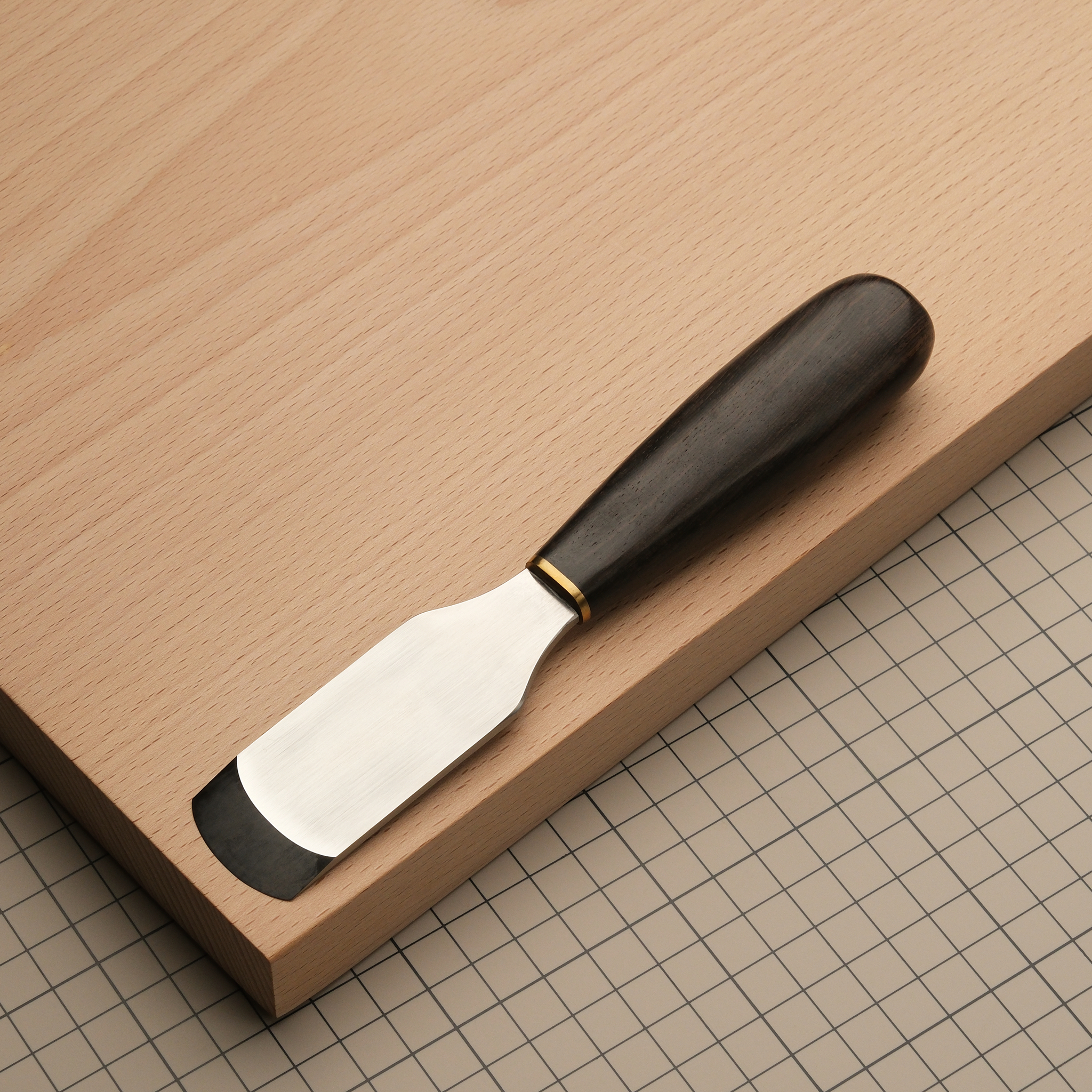 Образцовый вариант закругленного ножа для шерфовки. За счет длинного лезвия позволяет срезать кожу под очень малым углом, подходит под любую руку. Хорошо подходит для силового раскроя кожи. 10-сантиметровая ручка из эбена с латунным больстером. Очень эргономичная, приятно лежит в руке. Лезвие: 80*30*2 мм. Угол заточки - 10 градусов.