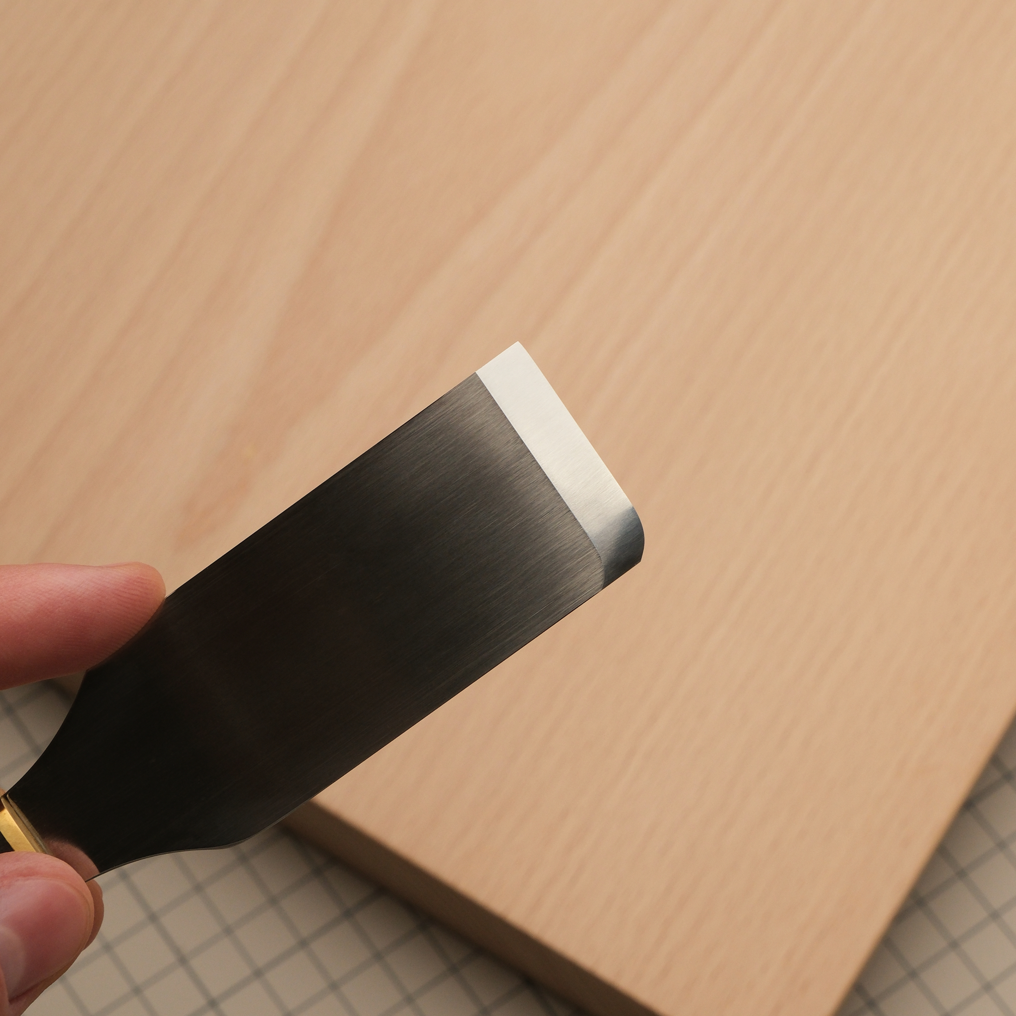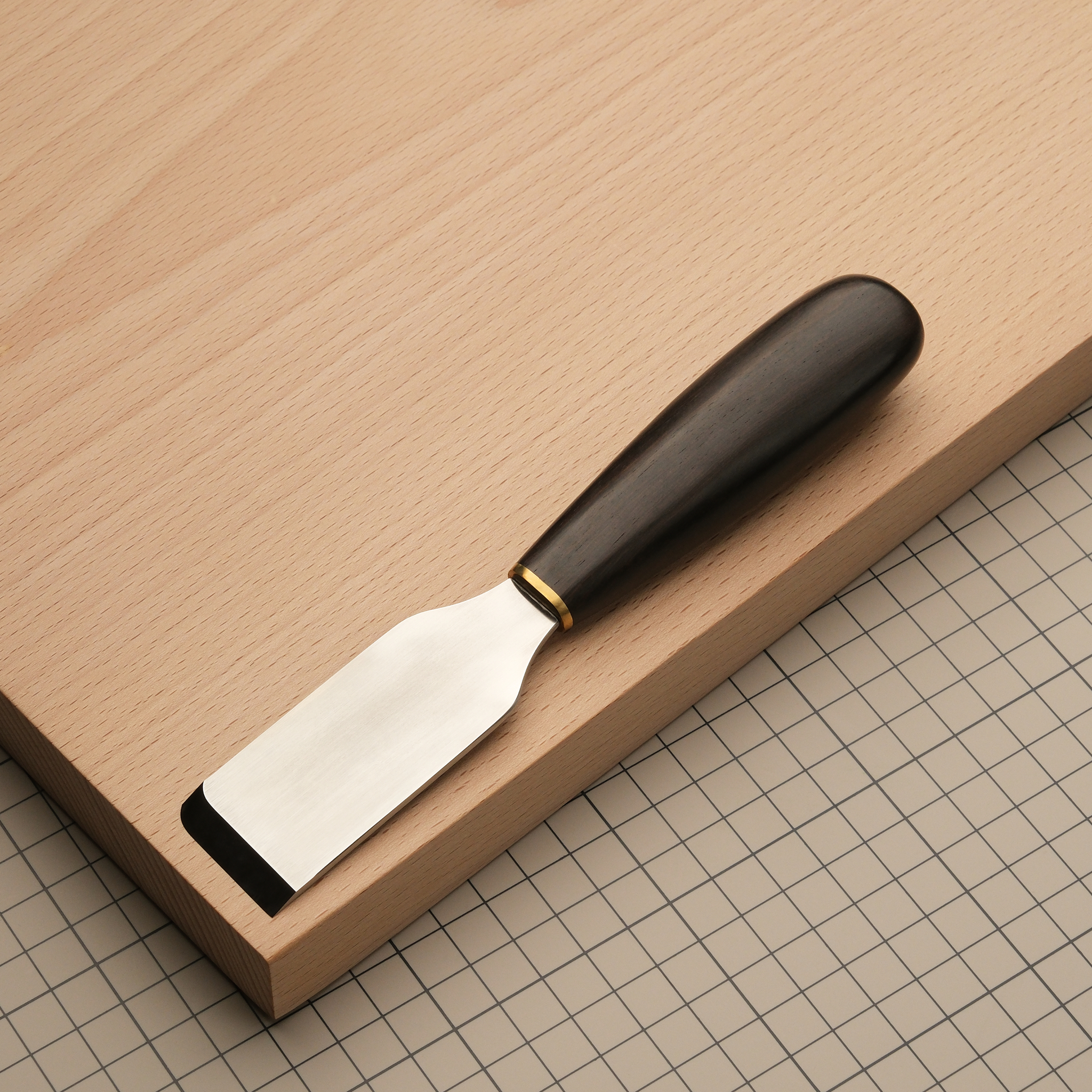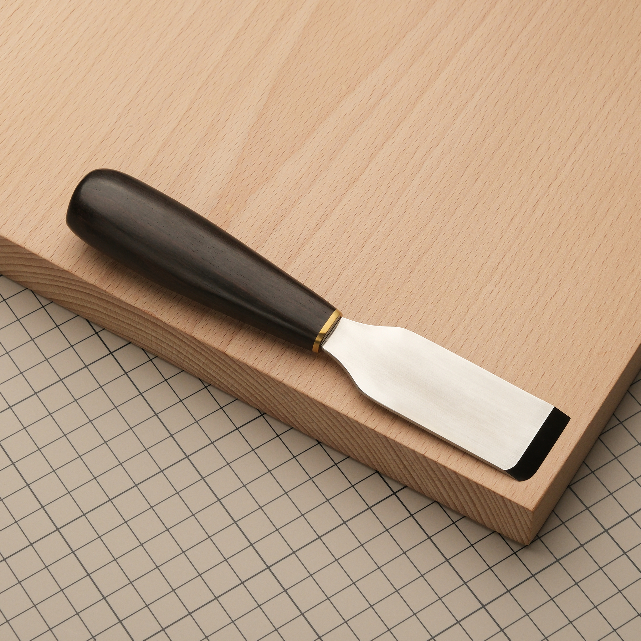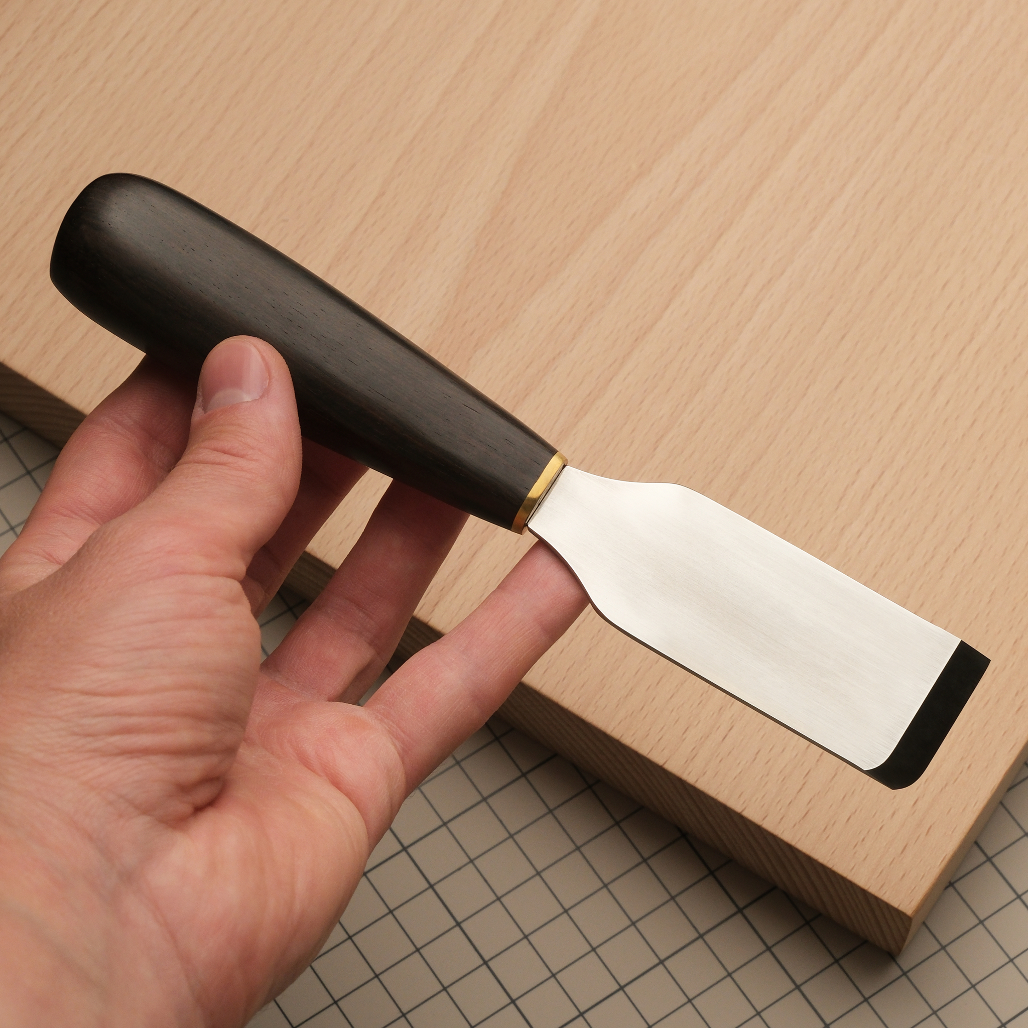 Превосходный нож, отличающийся от простого прямого небольшим закруглением с правого края. В хороших руках этот нож позволяет очень точно выполнять шерфовку, комфортно контролируя движение лезвия. Также отлично подходит для раскроя, в том числе силового. 10-сантиметровая ручка из эбена с латунным больстером. Очень эргономичная, приятно лежит в руке. Лезвие: 80*30*2 мм. Угол заточки - 15 градусов.