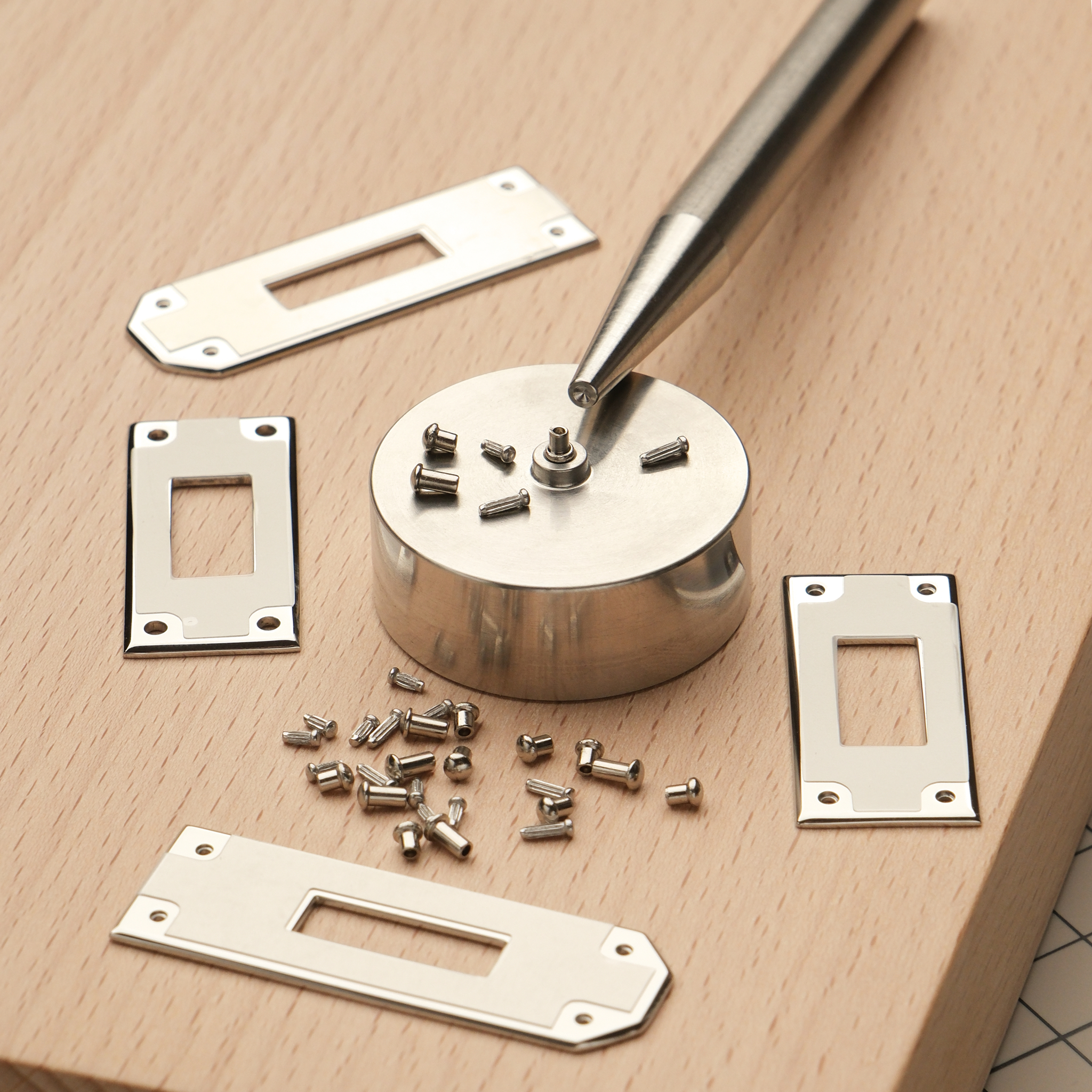 Стальной установщик для фурнитуры сумок HERMES Birkin, Kelly итд, которая идет на маленьких хольнитенах. Не подходит к гвоздикам! При установке рекомендую подкладывать пленку для фурнитуры, чтобы не поцарапать ее.